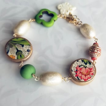 Florentine Bracelet – Rosy Pink Flower and Green Leaves Coins