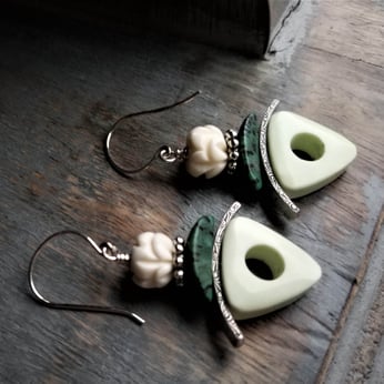 Black Tin Pale Pink Flowers Pottery Shard Earrings
