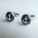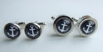 Classic nautical anchors are captured beneath a glass cabochon. 12mm cabochons (just under ½-inch) set in a smaller profile cuff link setting (14mm). [Last photo shows the small vs. large size cuff links.] Available in silver.