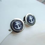Classic nautical anchors are captured beneath a glass cabochon. 12mm cabochons (just under ½-inch) set in a substantial cuff link setting (17mm). Available in silver and gold. Last photo shows other cabochon colors that thse cuff links can be made: ocean blue, navy, aqua, white, crimson red.