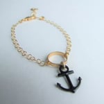 A black enamel anchor hangs from a matte gold circle connector. Light weight matte gold rolo bracelet chain.