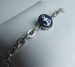 Classic nautical anchors on a navy background captured beneath a glass cabochon. 12mm cabochon (just under ½-inch). Lovely rope-style electroplated silver chain (electroplated silver over brass). Naturally lead and nickel-free; very durable finish. Last photo shows other cabochon colors that this bracelet can be made: ocean blue, navy, aqua, white, crimson red.