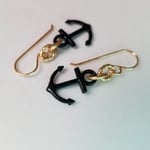 Simple, sophisticated anchor earrings. Black enameled anchors hang from matte gold rope links. Hanging from gold filled ear wires.