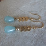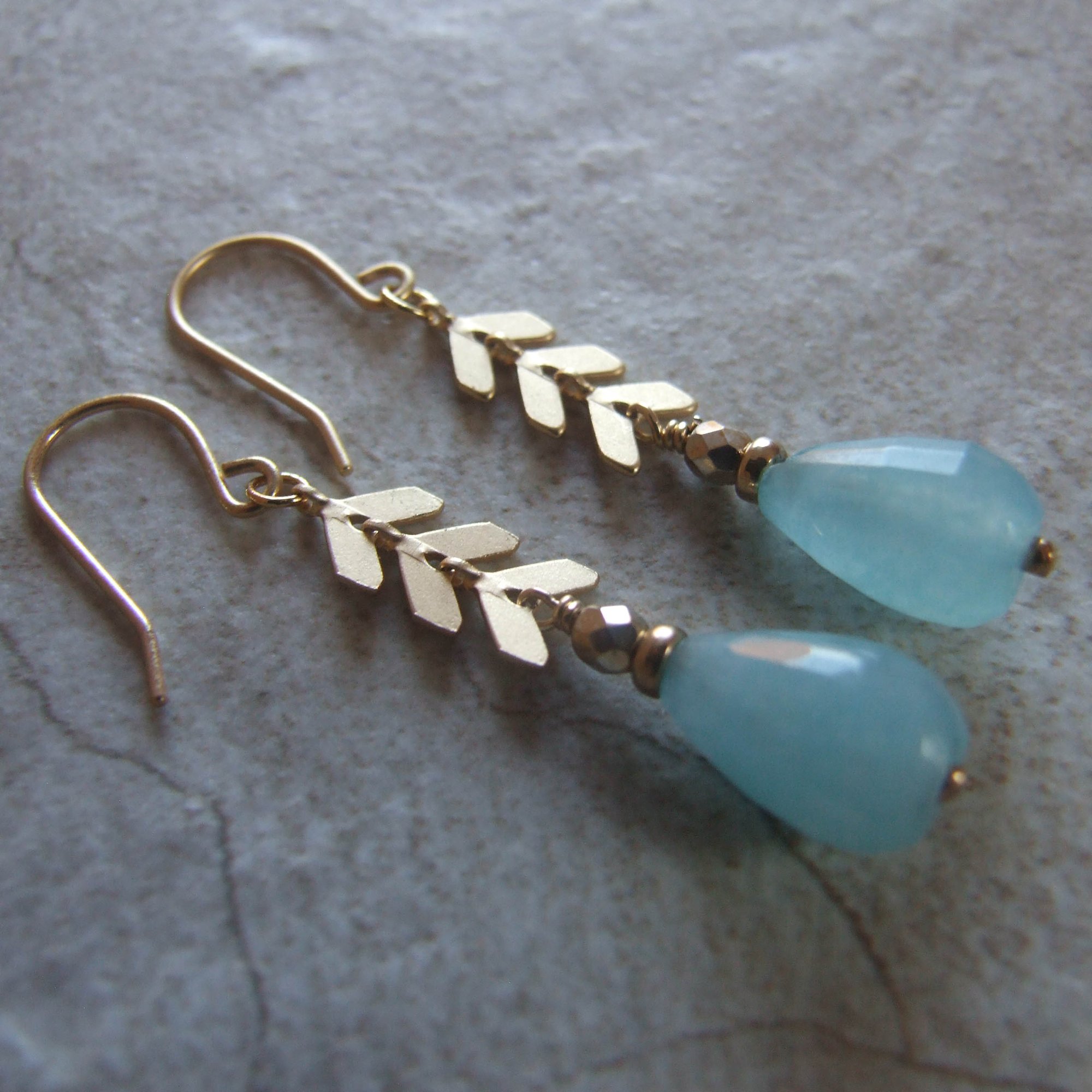 Simply lovely. Soft aqua blue jade drops dangle beneath beautiful matte gold chevron links. Beautiful swing. Hanging from simple matte gold plated brass ear wires (naturally lead and nickel free).