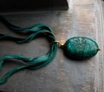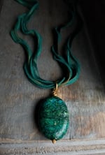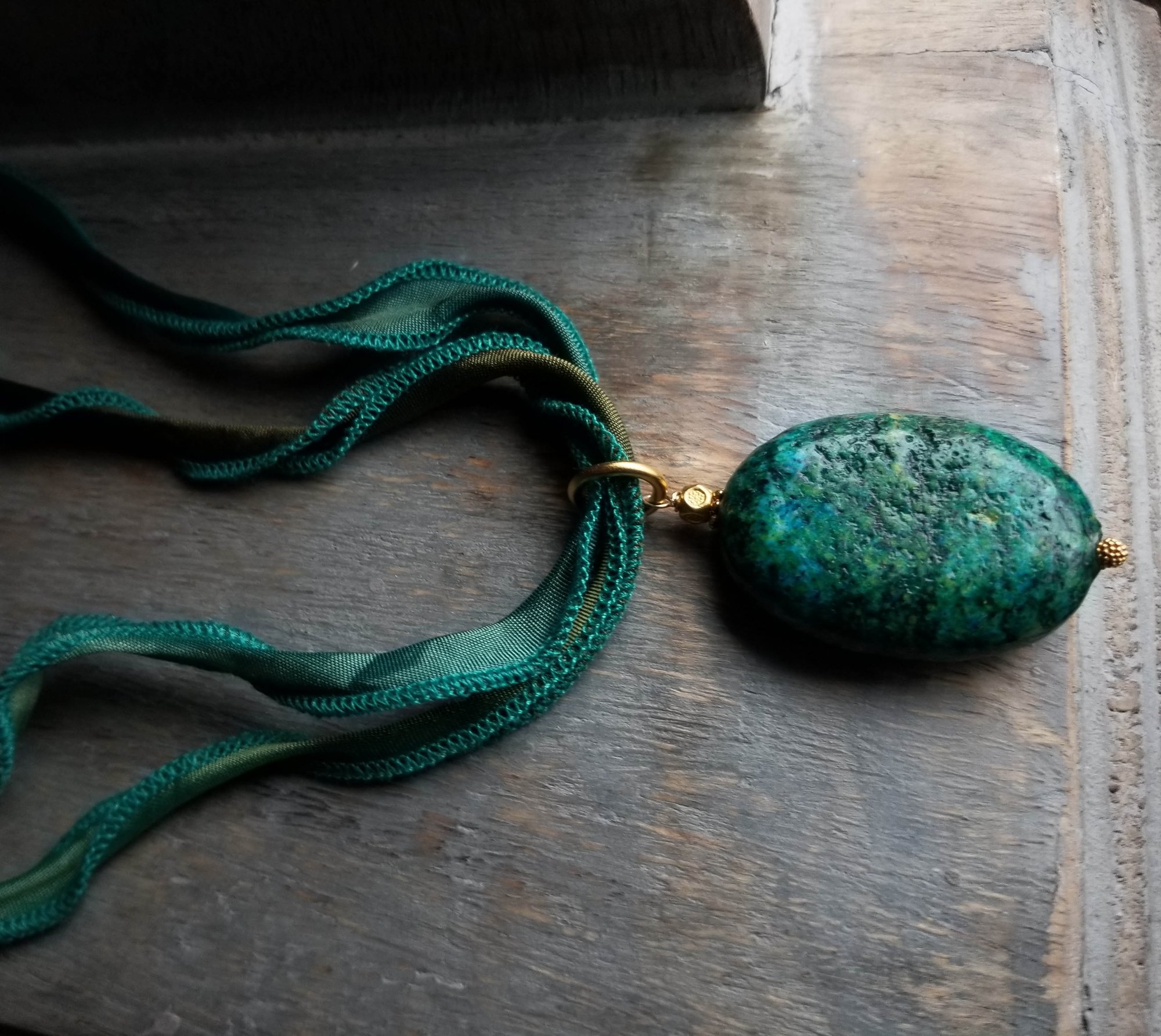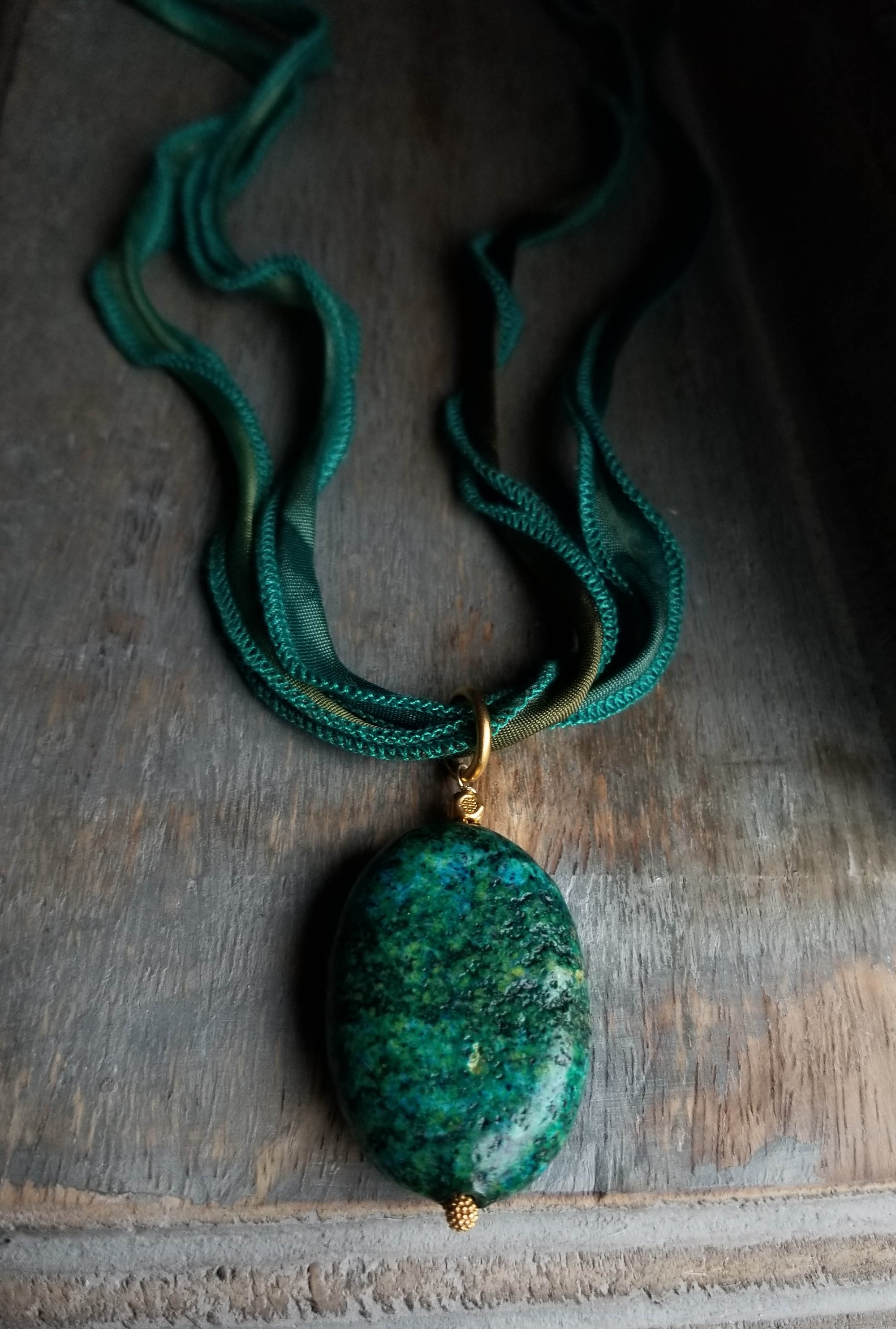 A beautiful and substantial azure pendant hangs from a double strand of lovely hand-dyed silk. Absolutely beautiful. Amazing color. The stone has an interesting texture that lends it a rustic feel. Pendant measures 2" (the stone along, measures 1-1/2"). Necklace length is adjustable from 19" - 21".