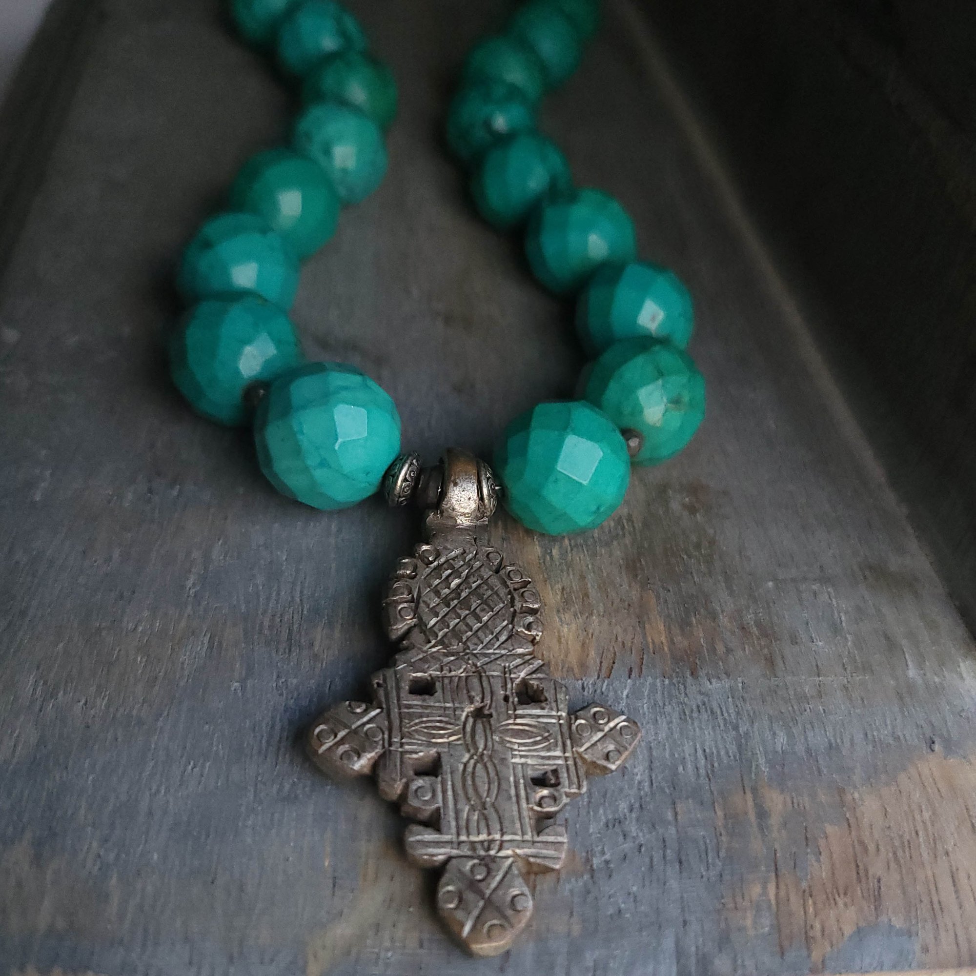 A one-of-a-kind necklace. Large (16mm) faceted turquoise beads punctuated with tiny faceted gray pyrite beads provide the perfect accompaniment for a medieval relic-style antique silver cross pendant.