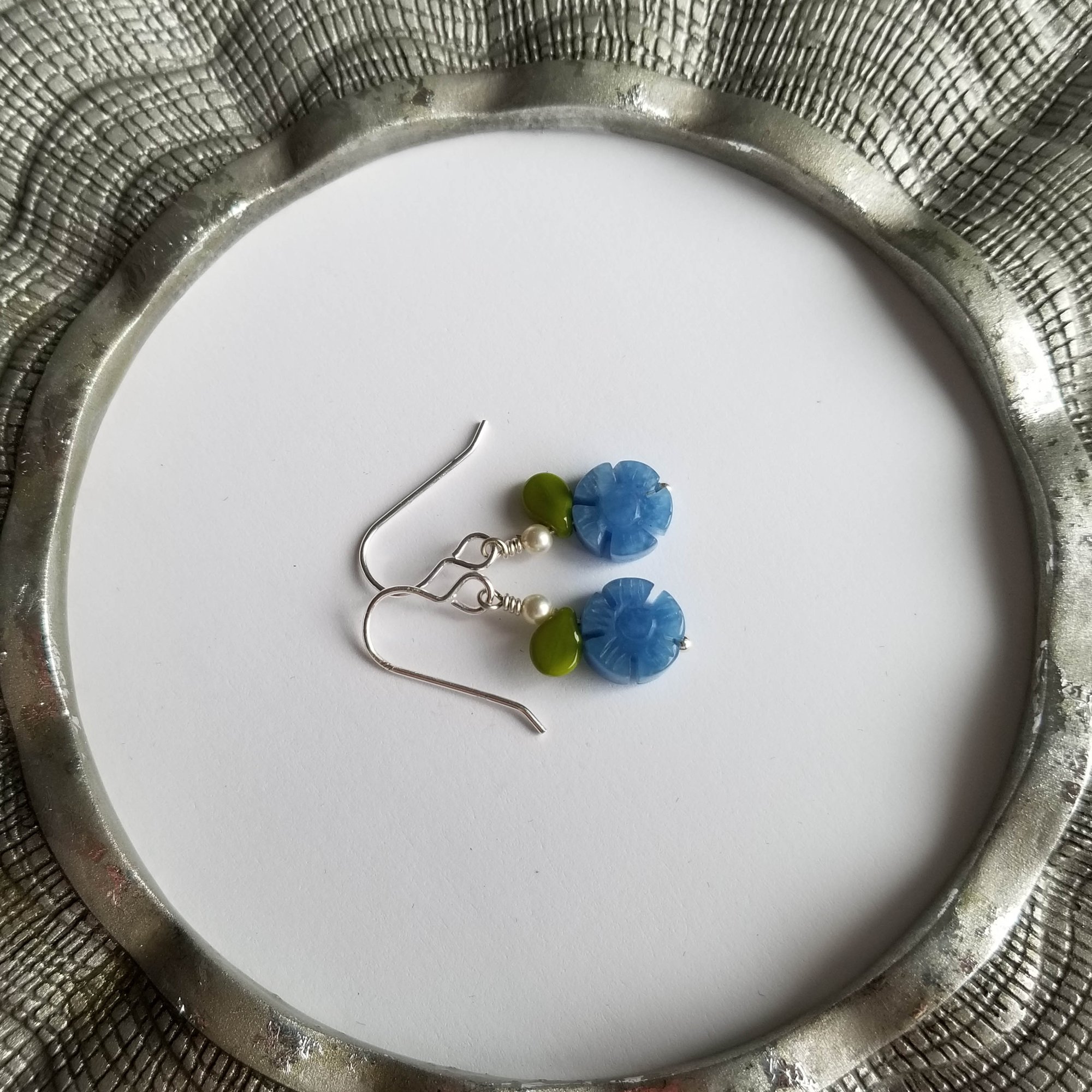 Carved blue jade flowers are topped by tiny green leaves and white Swarovski pearls. Hanging from sterling silver ear wires.