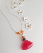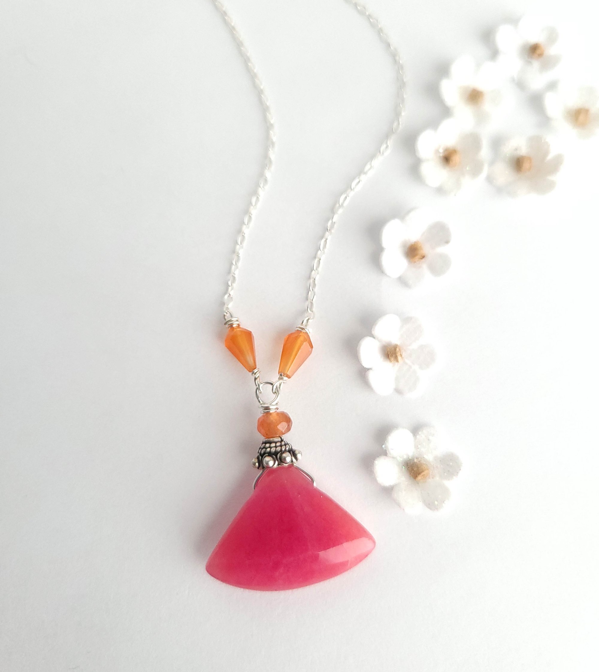 Such a pretty color combination! A faceted cherry-colored jade “fan” bead is topped a sterling silver bead cap and two faceted orange carnelian teardrop beads. This truly a simple and truly unique necklace that provides a lovely splash of color. Hanging from a fine sterling silver chain. Finished with a sterling silver lobster clasp.