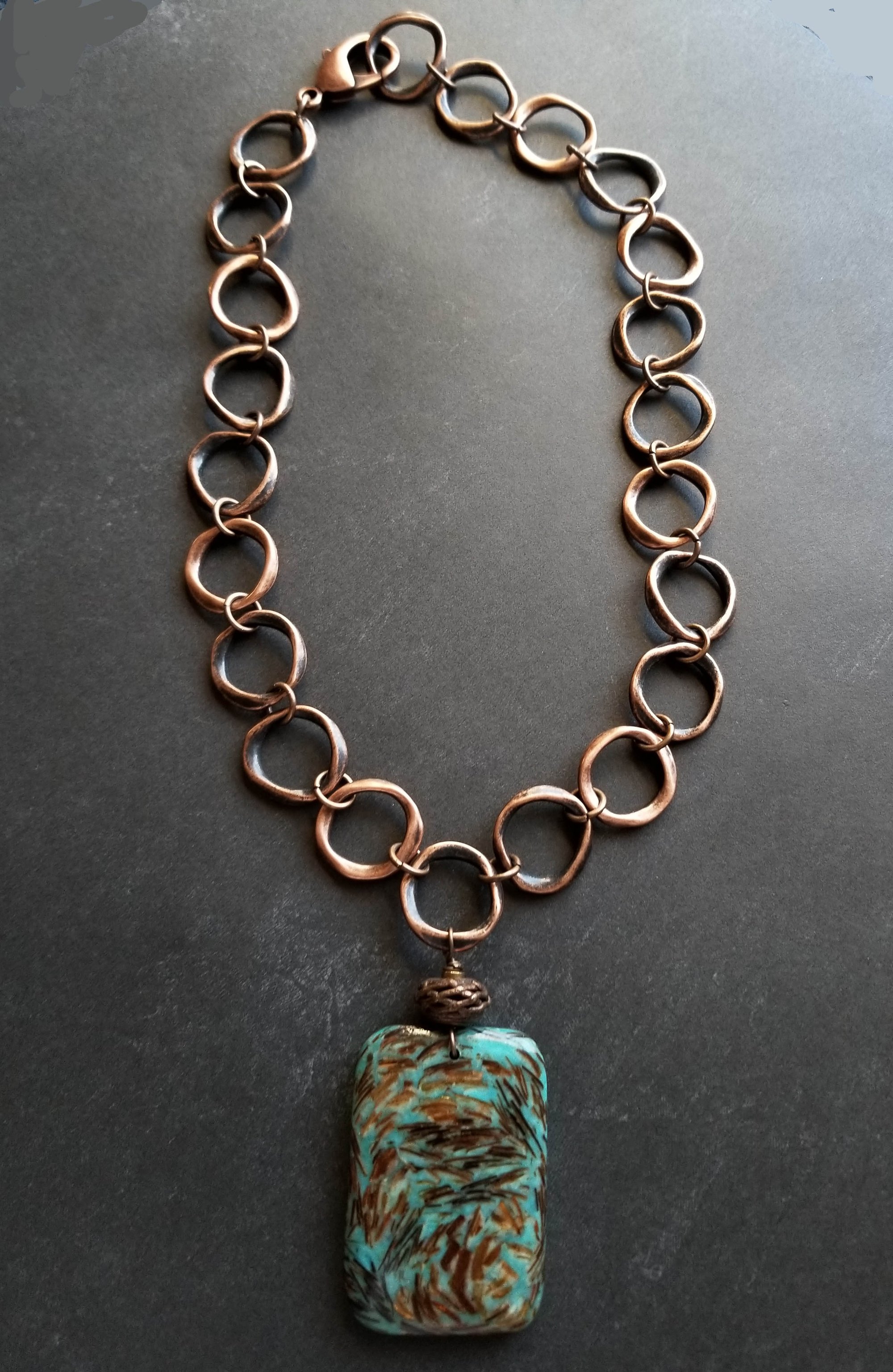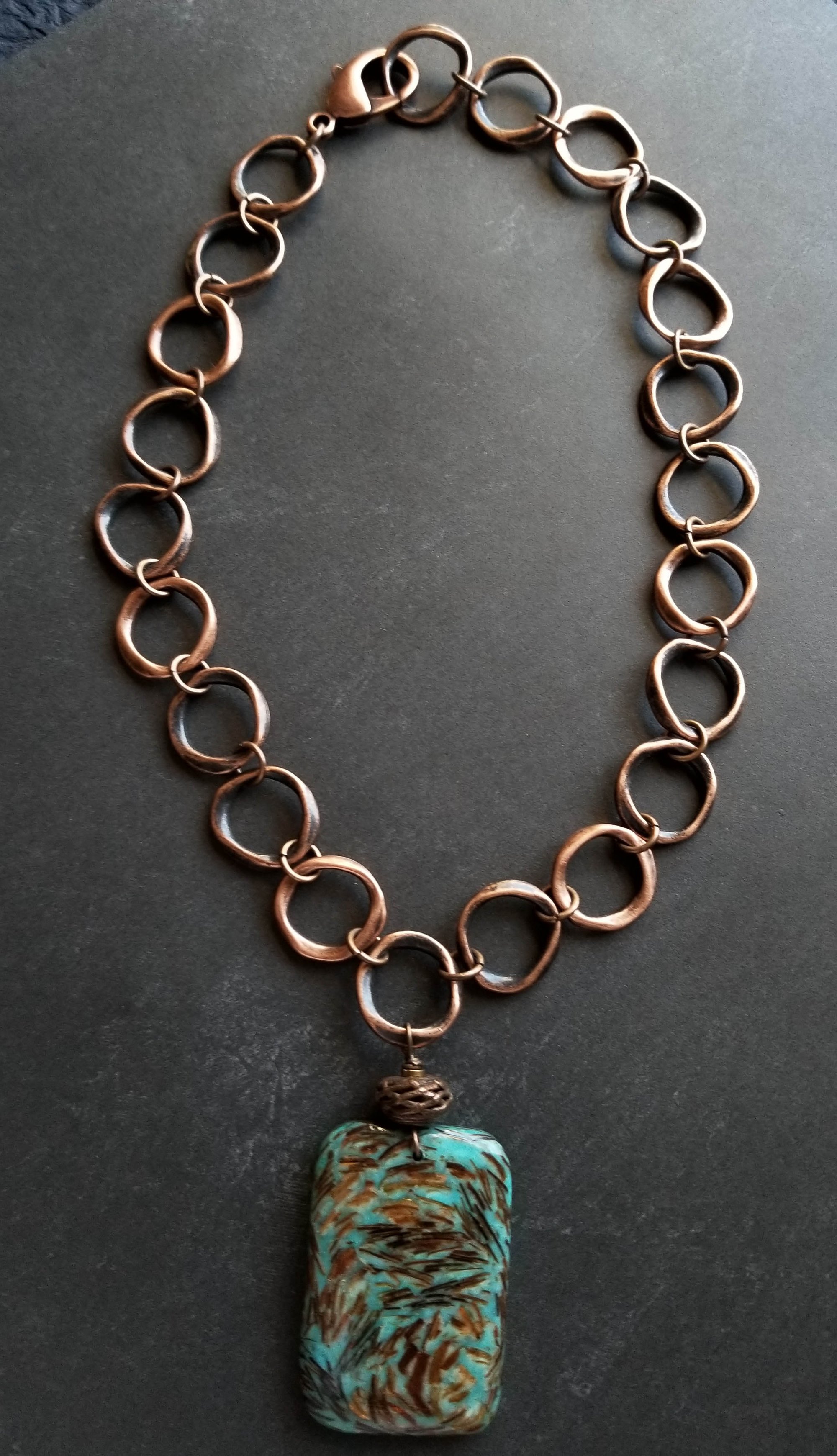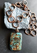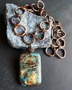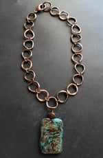 Unique and eye catching. A large and unusual pendant of bronzite and turquoise fused together to form a large and unique pendant. Hanging from an antique copper chain of large organic-shaped links. Pendant measures 2-¼”. Necklace length is up to 18”. Finished with a large (1”) antique copper lobster clasp. Quite a statement.