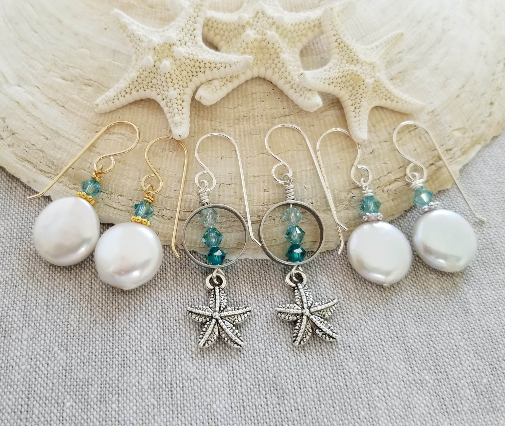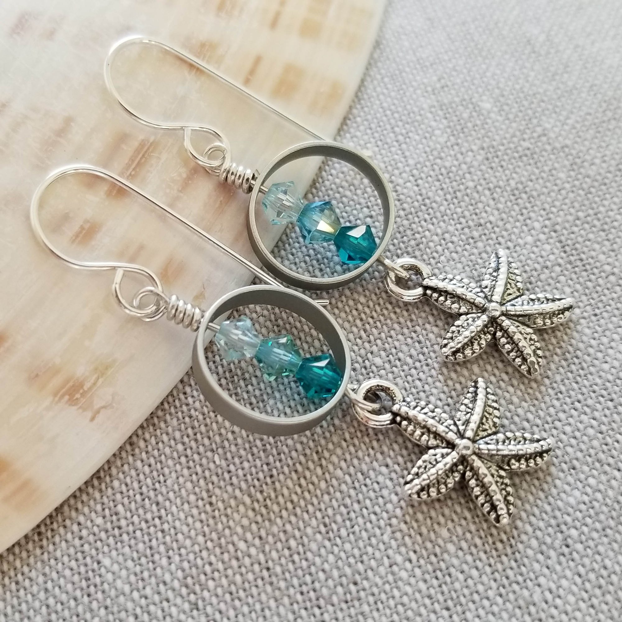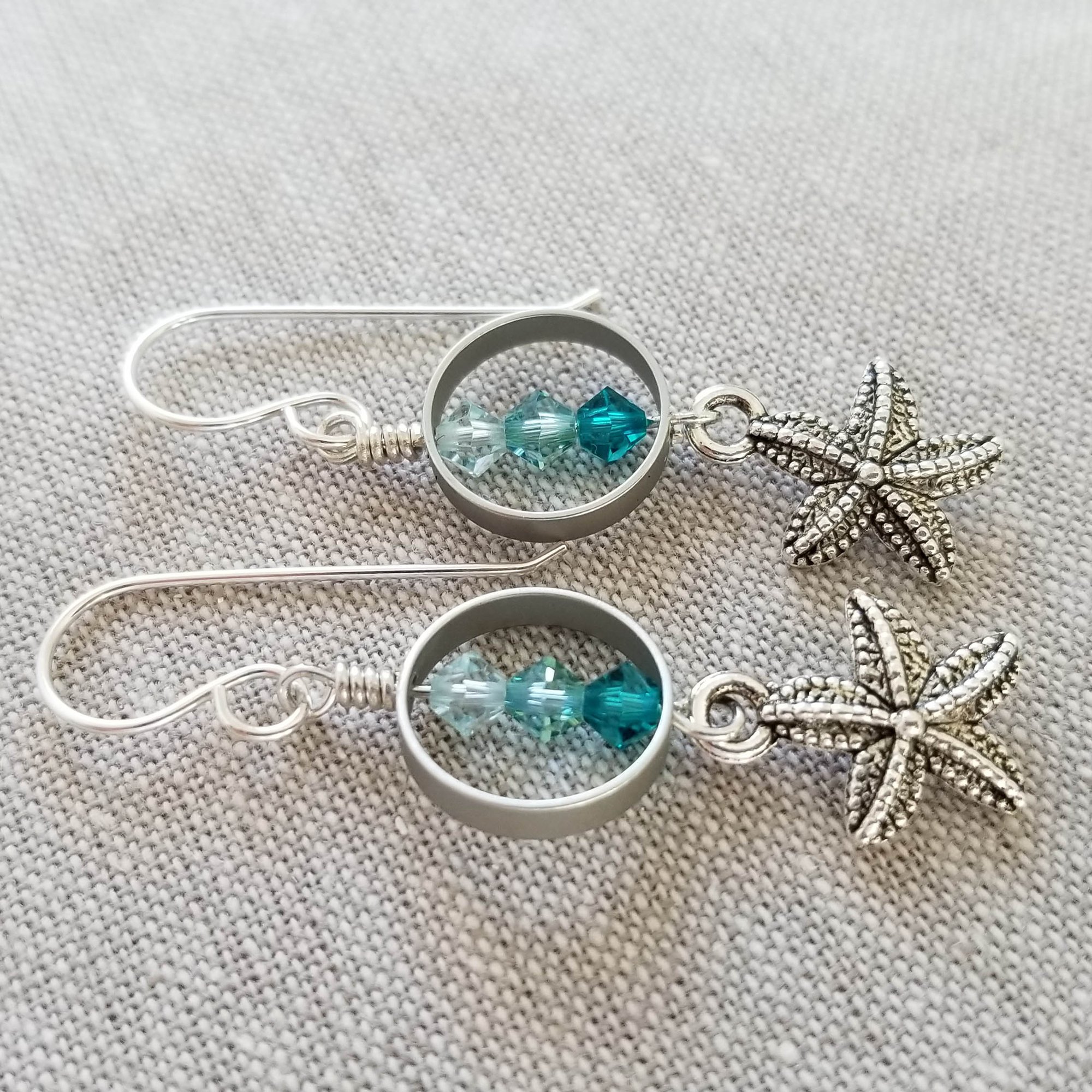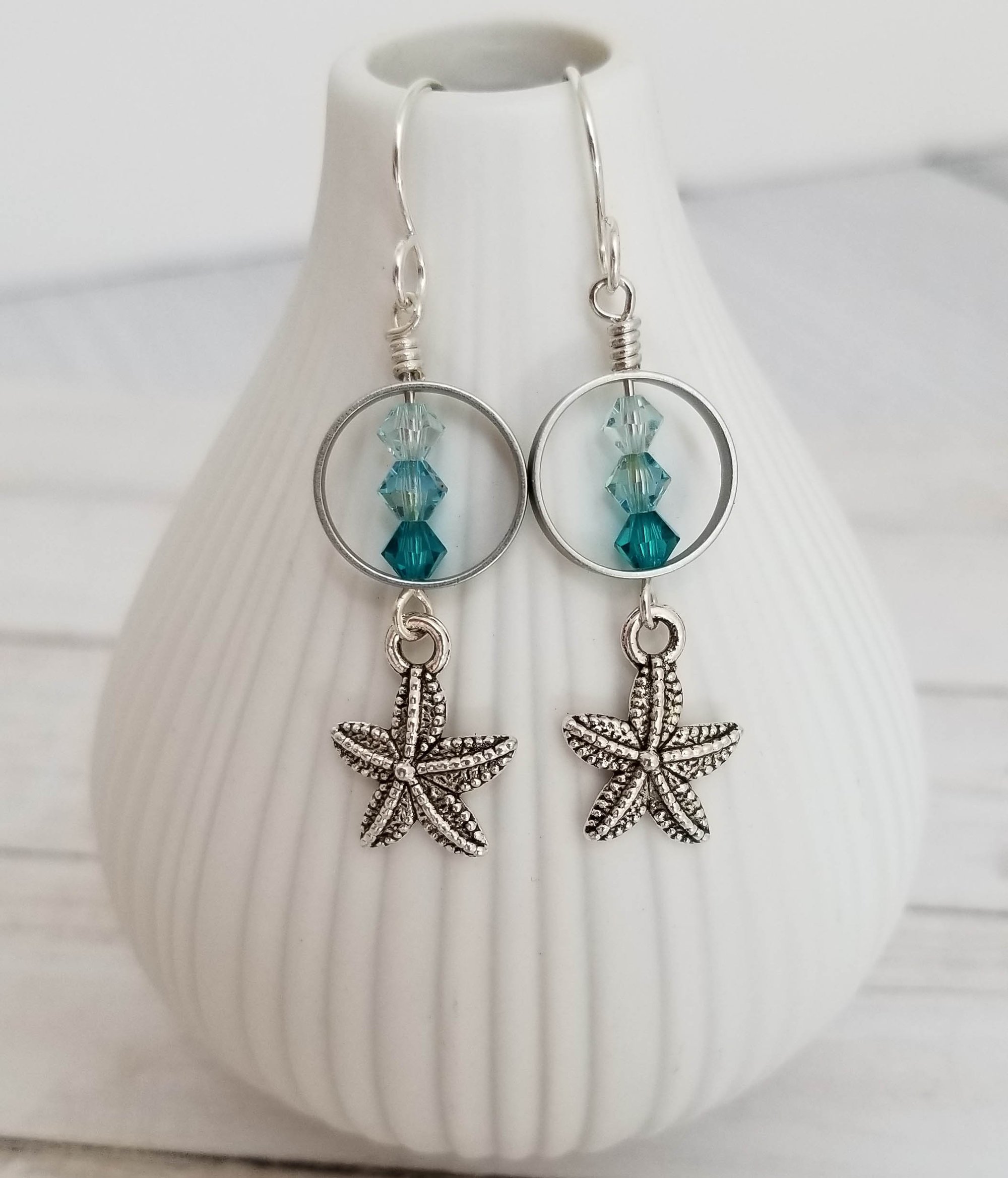 Lovely pewter starfish dangle beneath a colorful trio of seaside colored swarovski crystals. Sweet summer earrings. Hanging from sterling silver earwires.