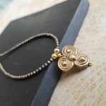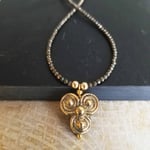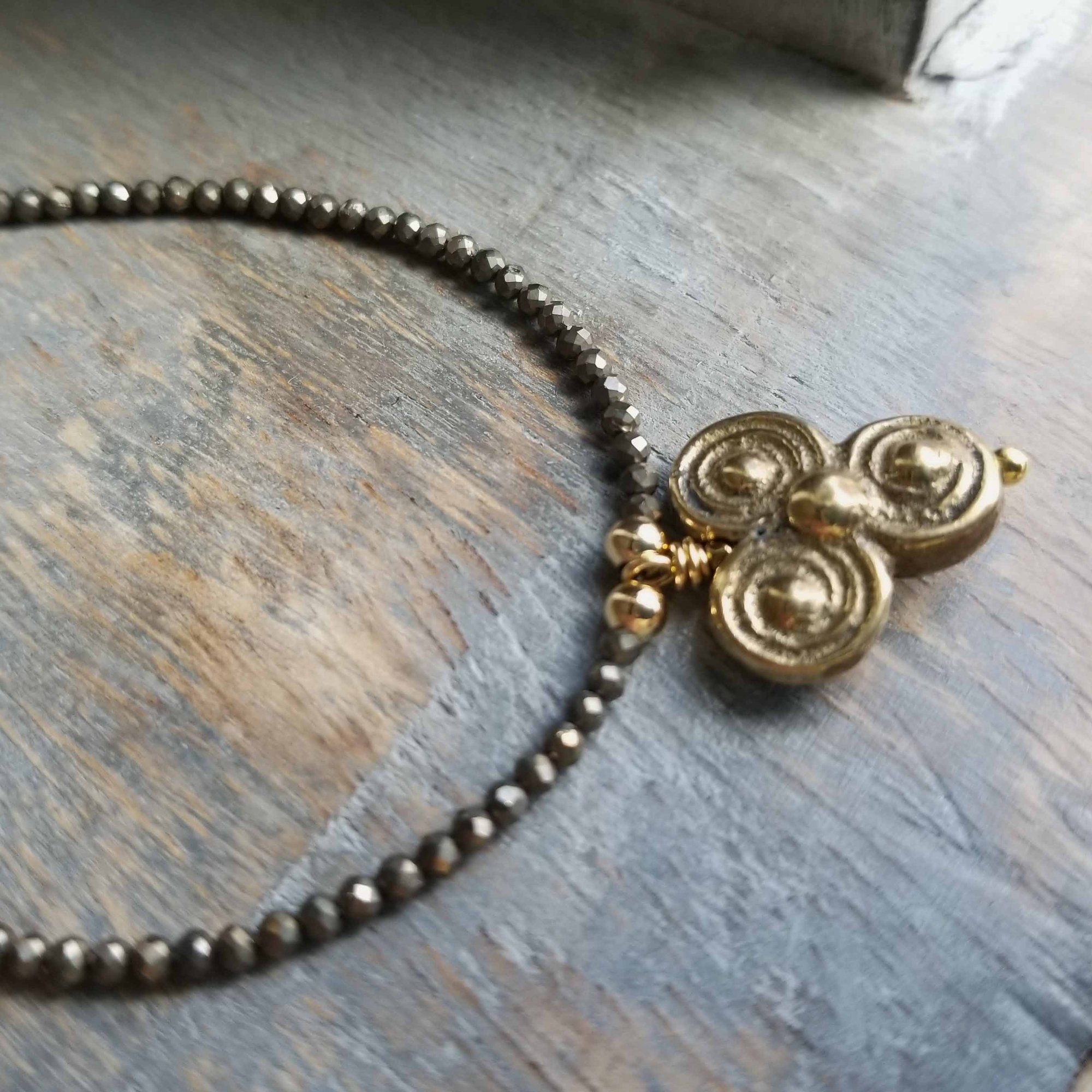 Minimalist + mystical style. A pretty antique gold Celtic Triskele mandala charm hangs from a necklace of tiny (3mm) faceted golden pyrite. The triple circles of the Celtic Triskele represent the three material realms: earth, water, sky. It’s one of the oldest Irish symbols. A simple and unique necklace.