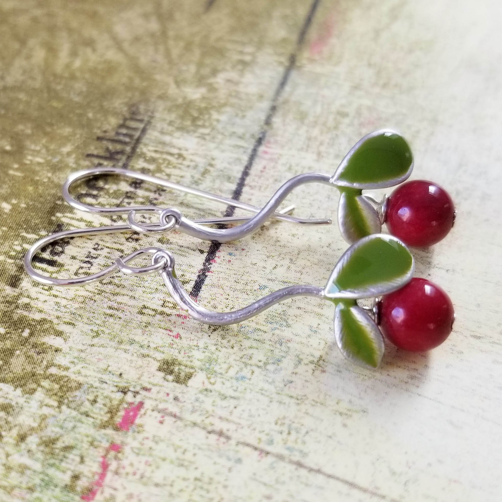 Cheerful + tart. Deep red glass beads hang like cherries at the bottom of these green enamel stems. Hanging from sterling silver ear wires.