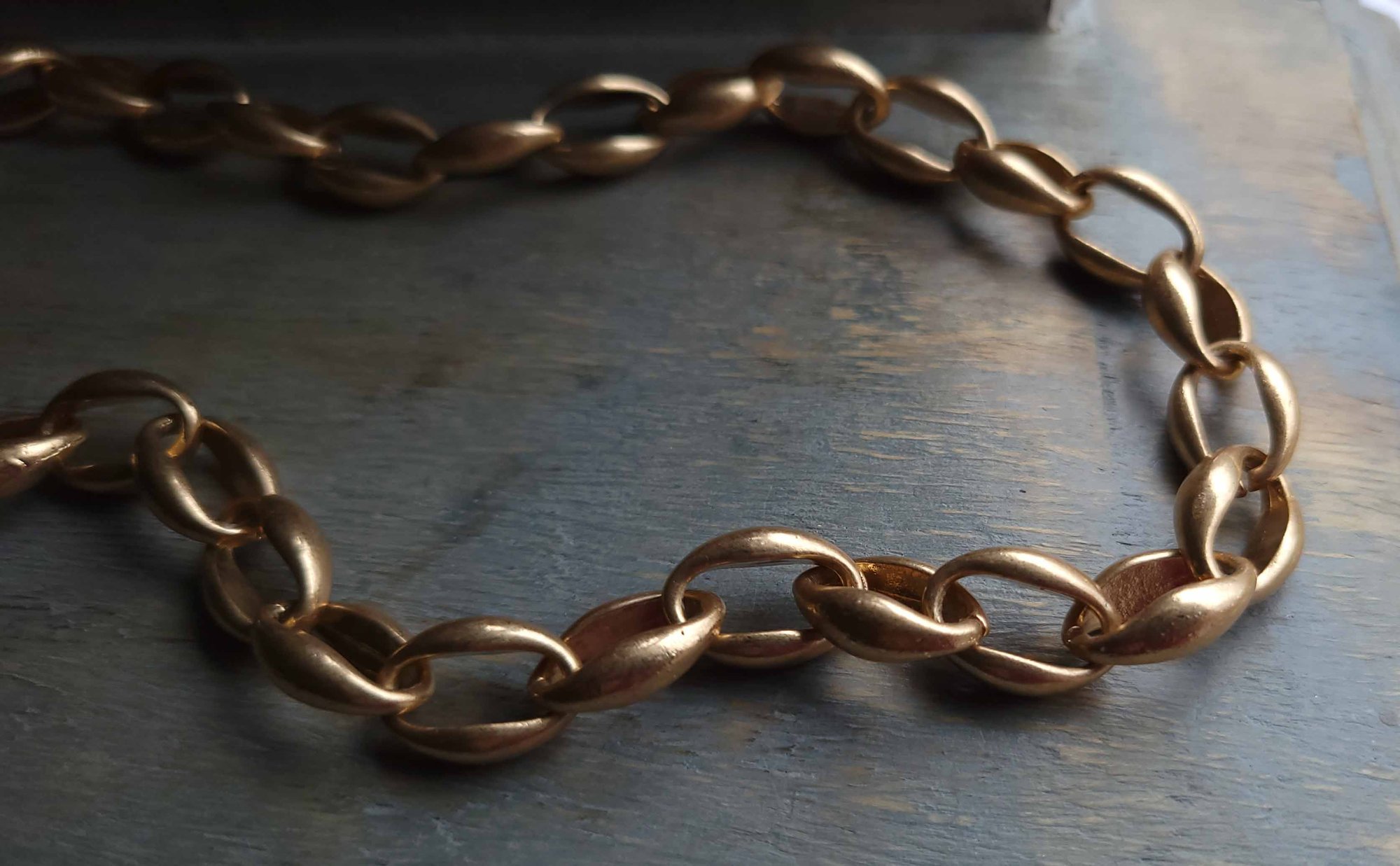 A beautiful chunky, soft-colored gold chain necklace, in its simplicity, is a lovely classic accessory. The patina on this chain is fabulous, very similar to karat gold.