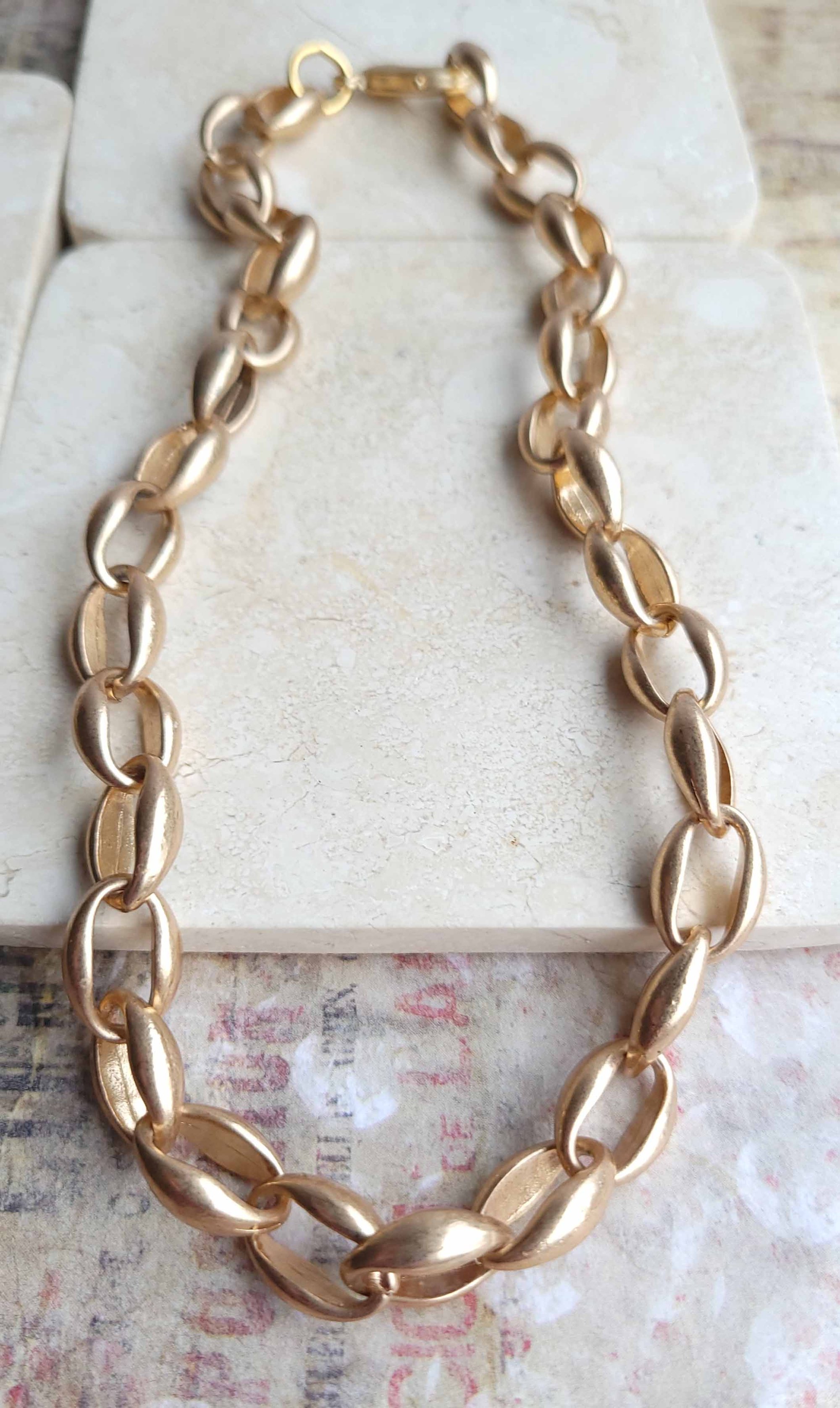 Individual chain links measure .62” x .43”. Chain is electroplated gold (for durability) zinc alloy (allergy free from lead and nickel). Necklace length is 17”. Finished with a ¾” matte gold lobster clasp.