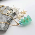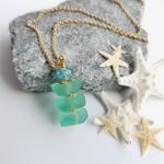 Pretty stacked chunky emerald cultured sea glass beads make a kicky pendant for this breezy summer necklace. Long (33") matte gold chain. Pendant length is 1-1/4". Simple and sweet summer accessory.