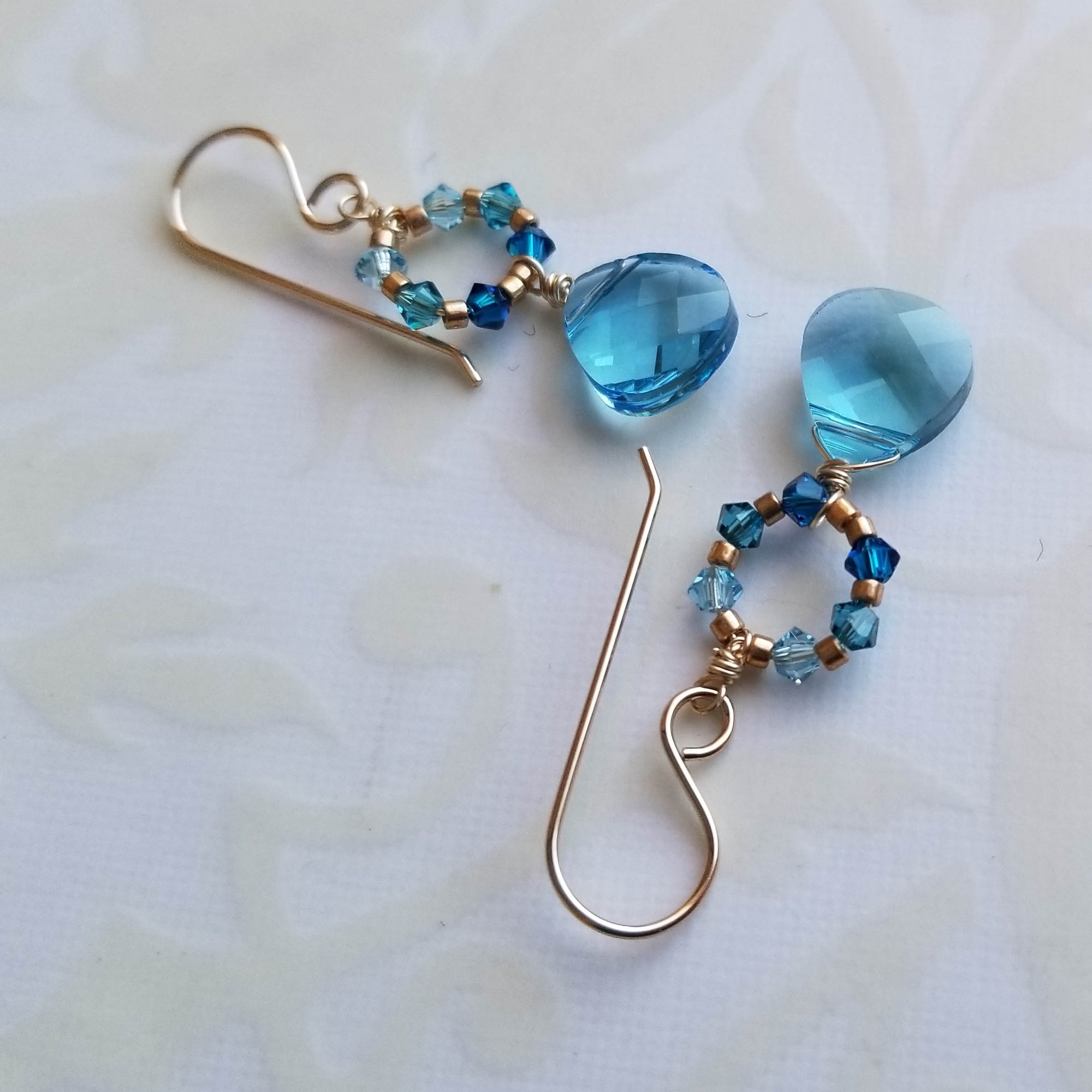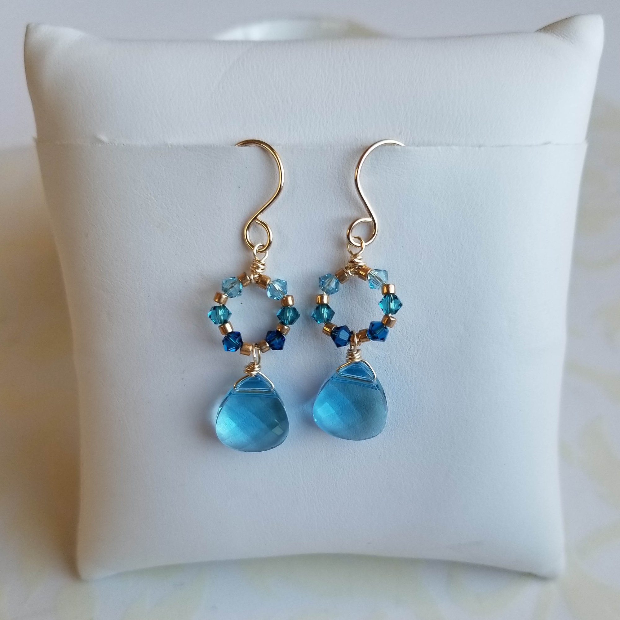Swarovski crystals in refreshing water tones form a circular wreath; a faceted aqua blue Swarovski crystal teardrop sways below the wreath. Simple gold filled French earwires.