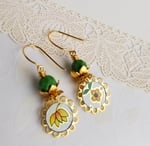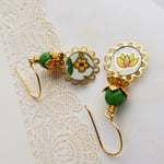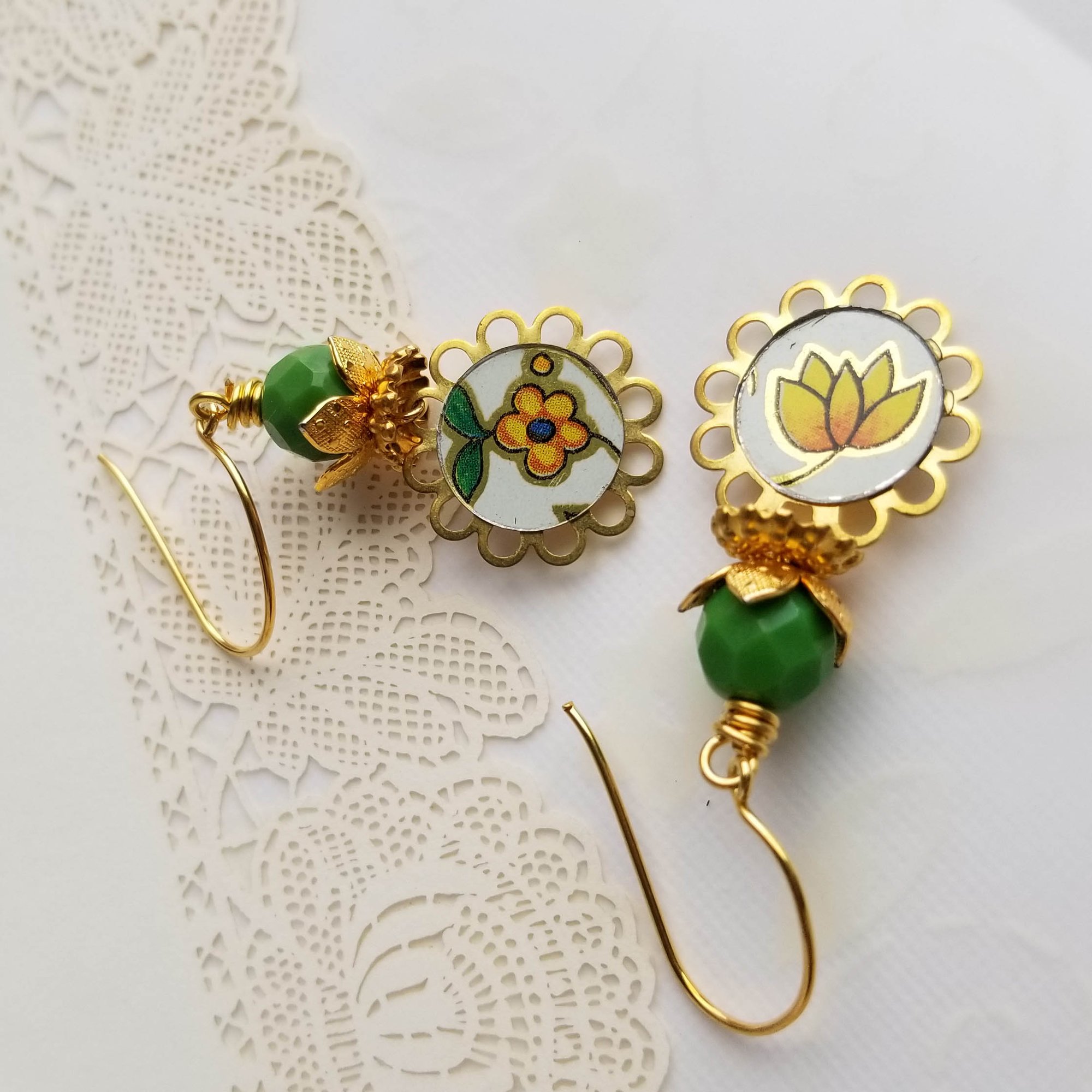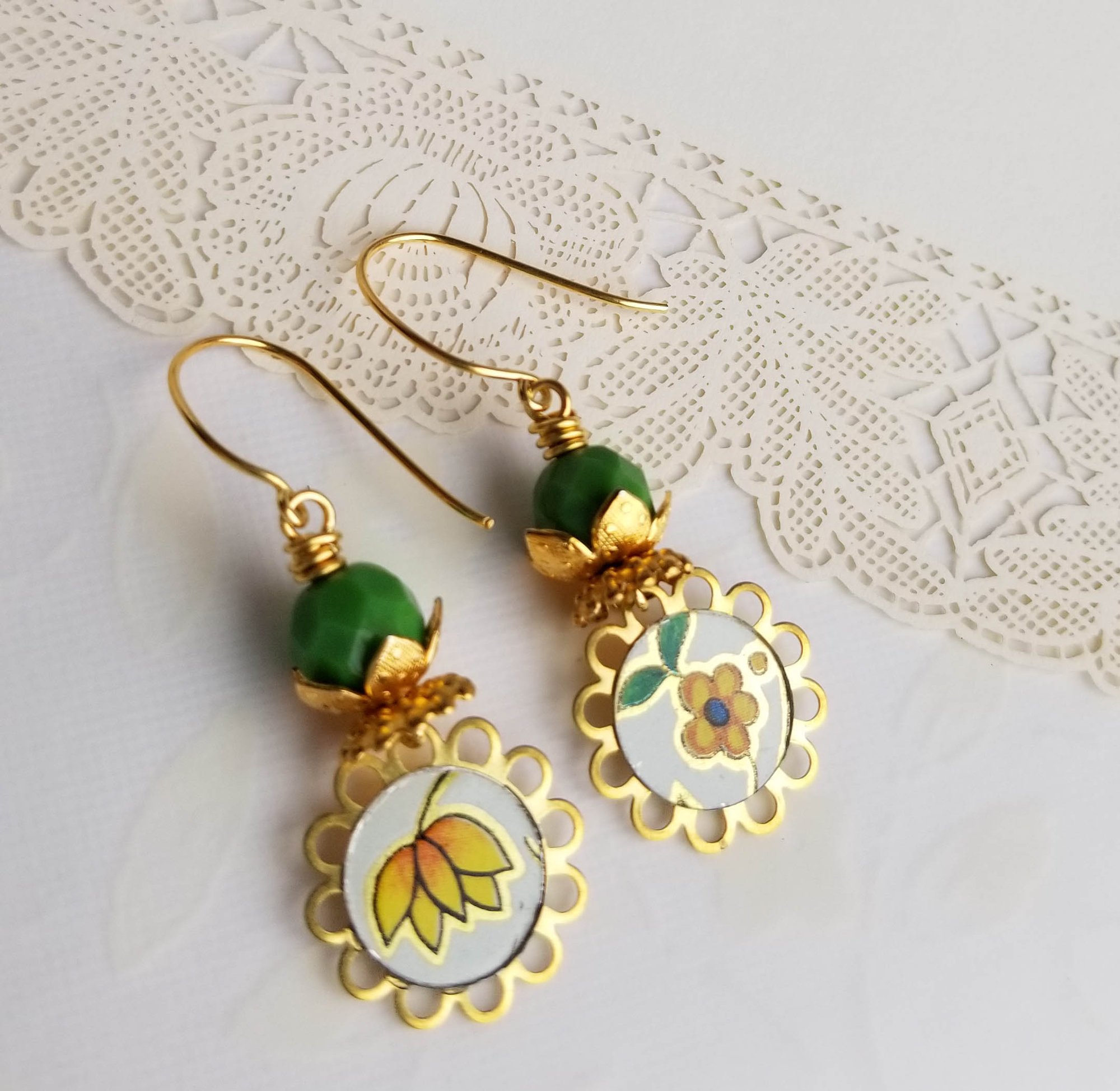 Super sweet and happy. Yellow flower coins cut from a vintage cookie tin dangle beneath faceted green Czech glass nestled within brass leaves. Hanging from gold vermeil ear wires.