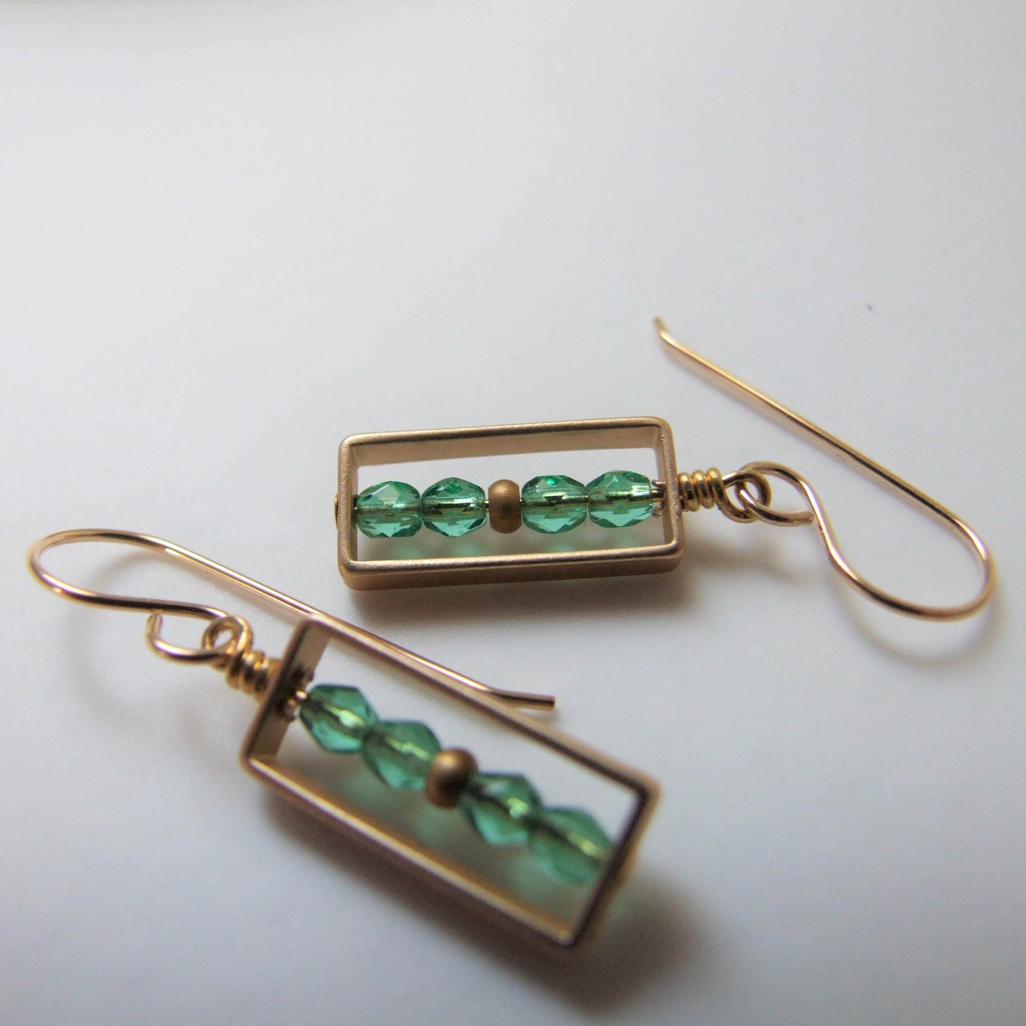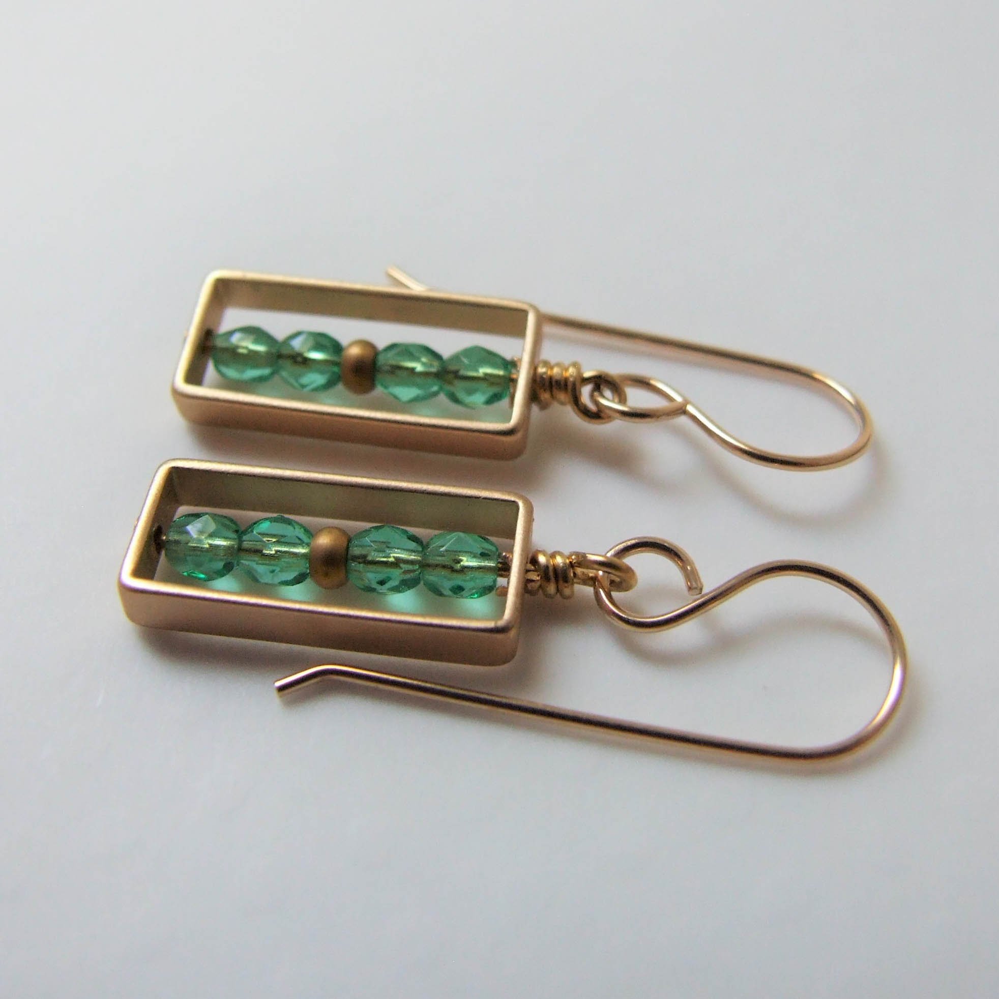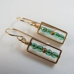 Tiny faceted emerald-colored Czech glass beads are encased within a matte gold rectangle. Lovely geometric design. Hanging from gold-filled ear wires.