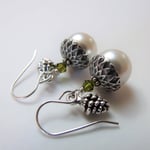 Plump white Swarovski pearls topped by pewter acorn caps and Swarovski crystals. Tiny pewter pine cones add to these picture perfect earrings. All dangling from a simple sterling silver ear wires. Length is 1-1/2" from the top of the earwire to the bottom of the pearl.