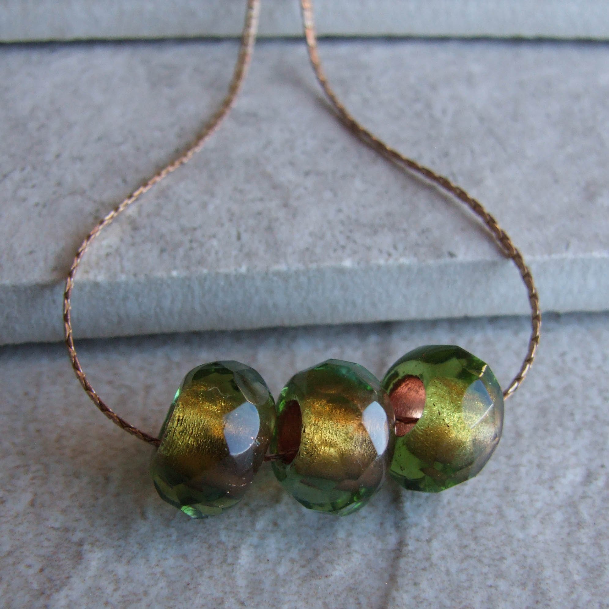 Exquisite copper lined fern-green beads slide along a slim shiny vintage brass chain. Lovely. Casual. Elegance. Length is 16 – 18”. Brass lobster clasp.