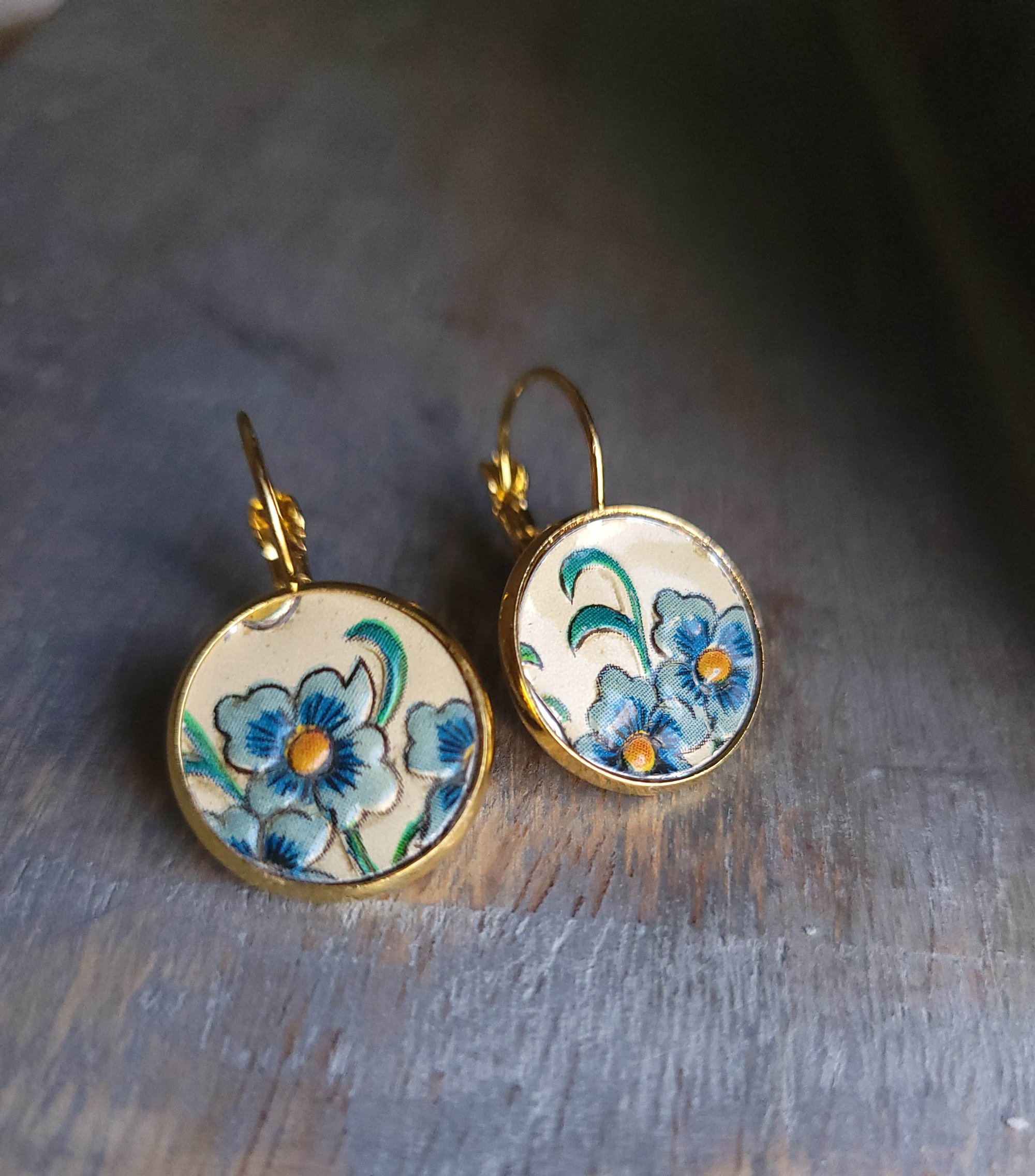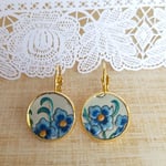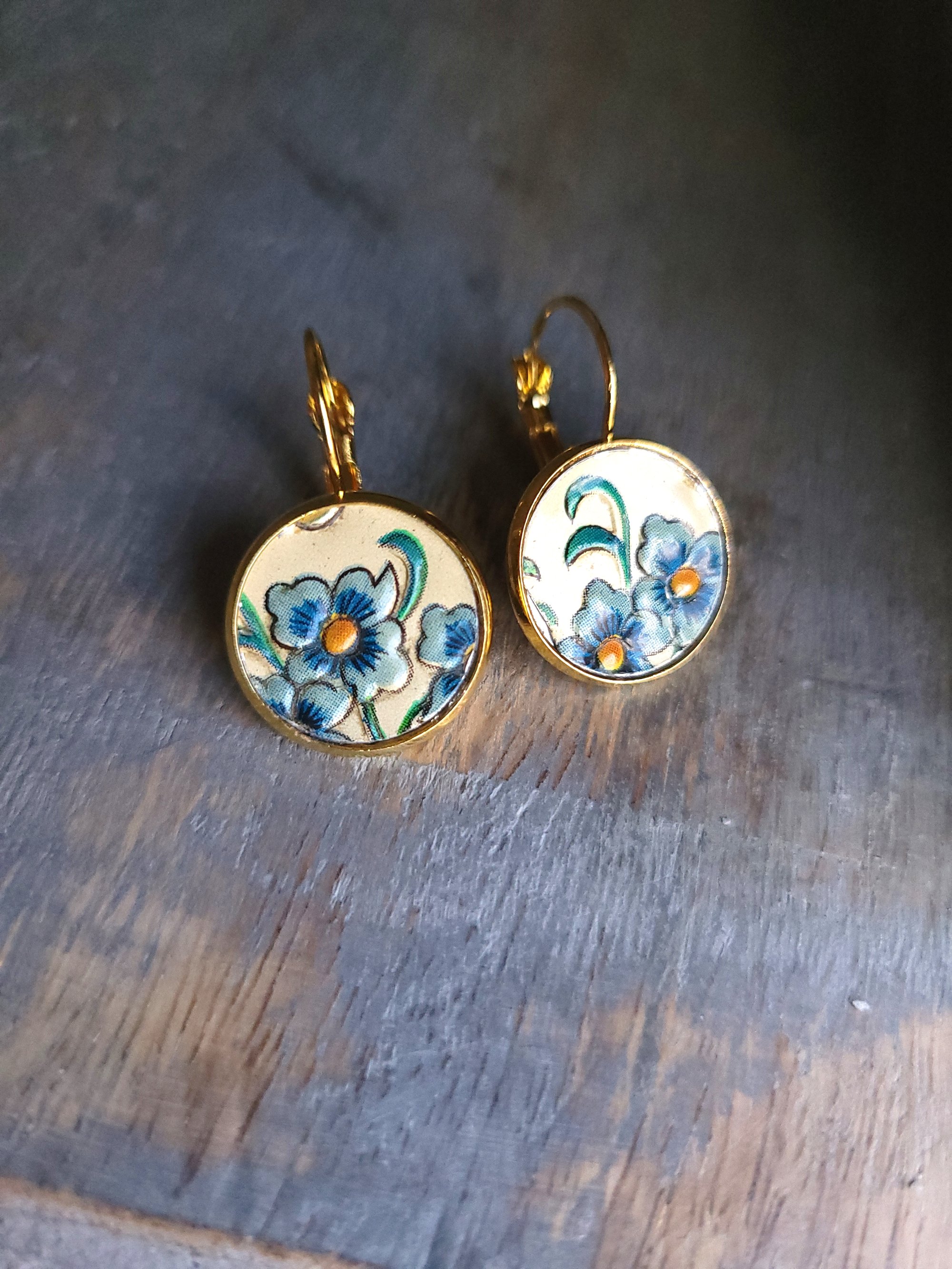 These charming earrings are surely a welcome harbinger of spring. Cut from a vintage cookie tin, the raised-relief forget-me-not flowers are captured within gold-plated brass bezel (16mm) lever back earrings (naturally lead + nickel free).