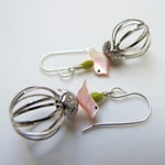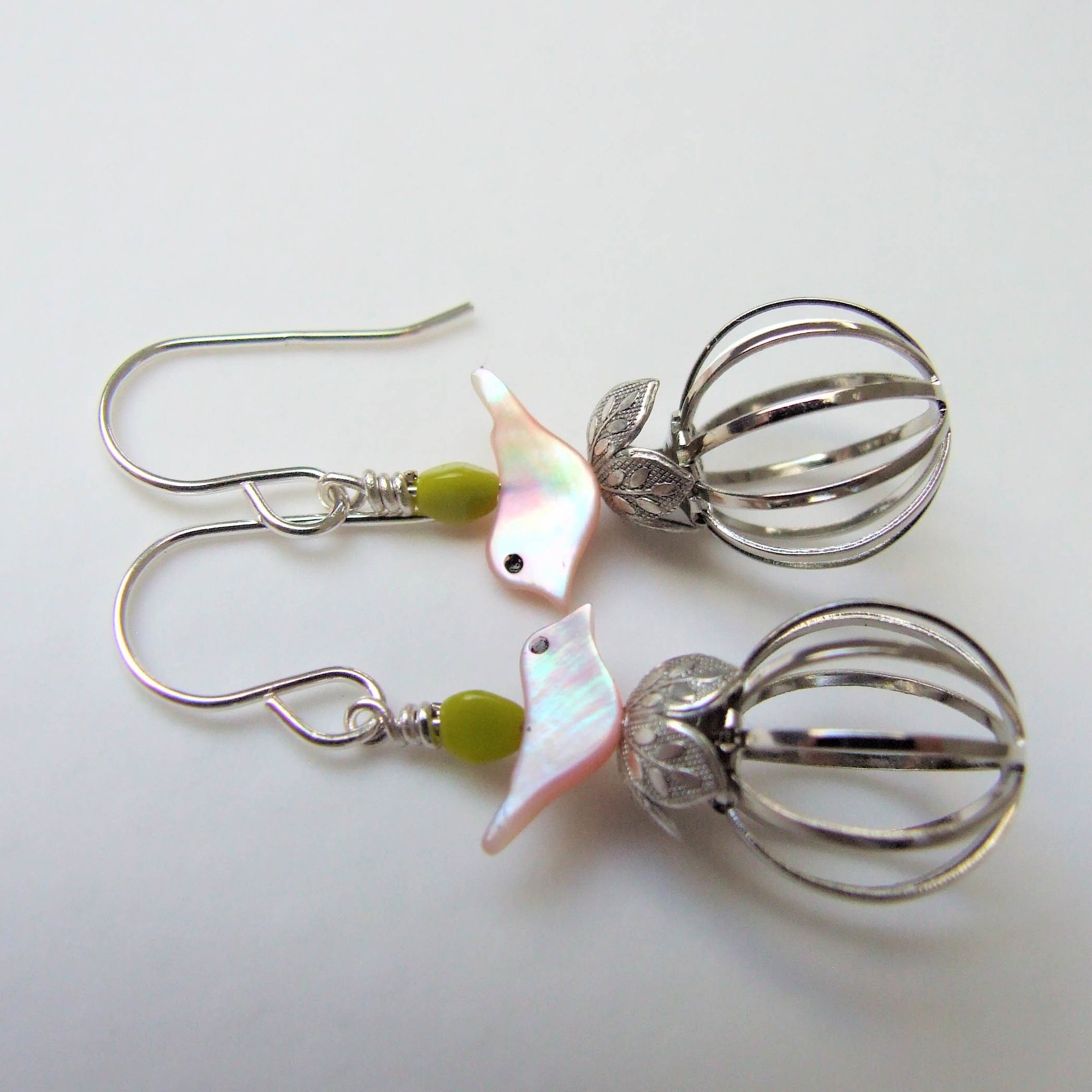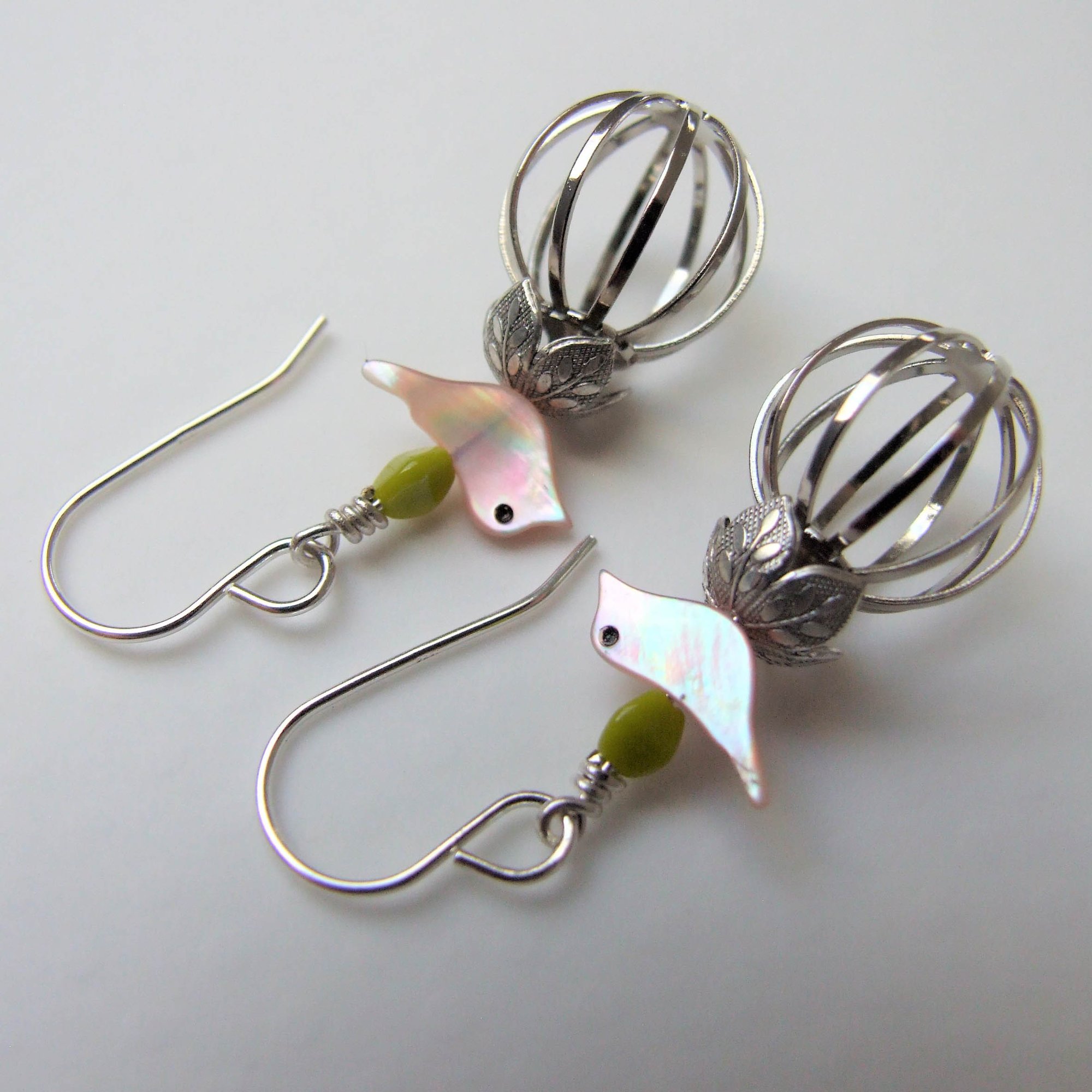 A bevy of whimsy. Pale pink mother of pearl birds sit freely atop a silver cage. Hanging from sterling silver ear wires. You'll love having these fine feathered friends on board for the ride.