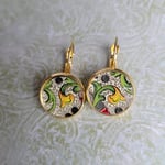 Coins, hand cut from a vintage cookie tin, are embellished with a frilly Florentine design. The coins are nestled into a shiny gold bezel lever back earring. Classic Italian design. Feminine. Unique.