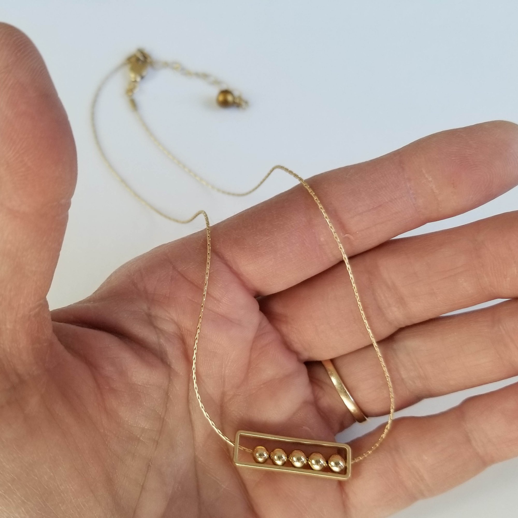 Beautifully sophisticated. Gold filled beads are nestled in a matte gold frame to form an abacus pendant. Ultra slim matte gold chain. A soft whisper of a necklace.