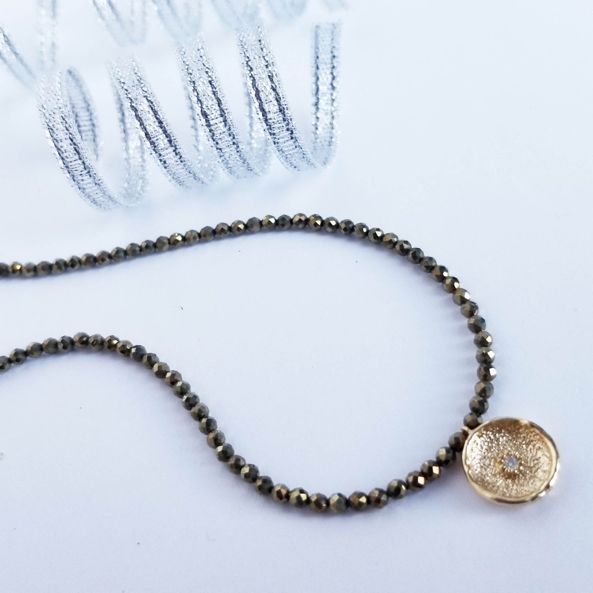 A pretty gold coin pendant accented with a tiny cubic zirconia is nestled within a necklace of tiny faceted shimmering golden pyrite beads.