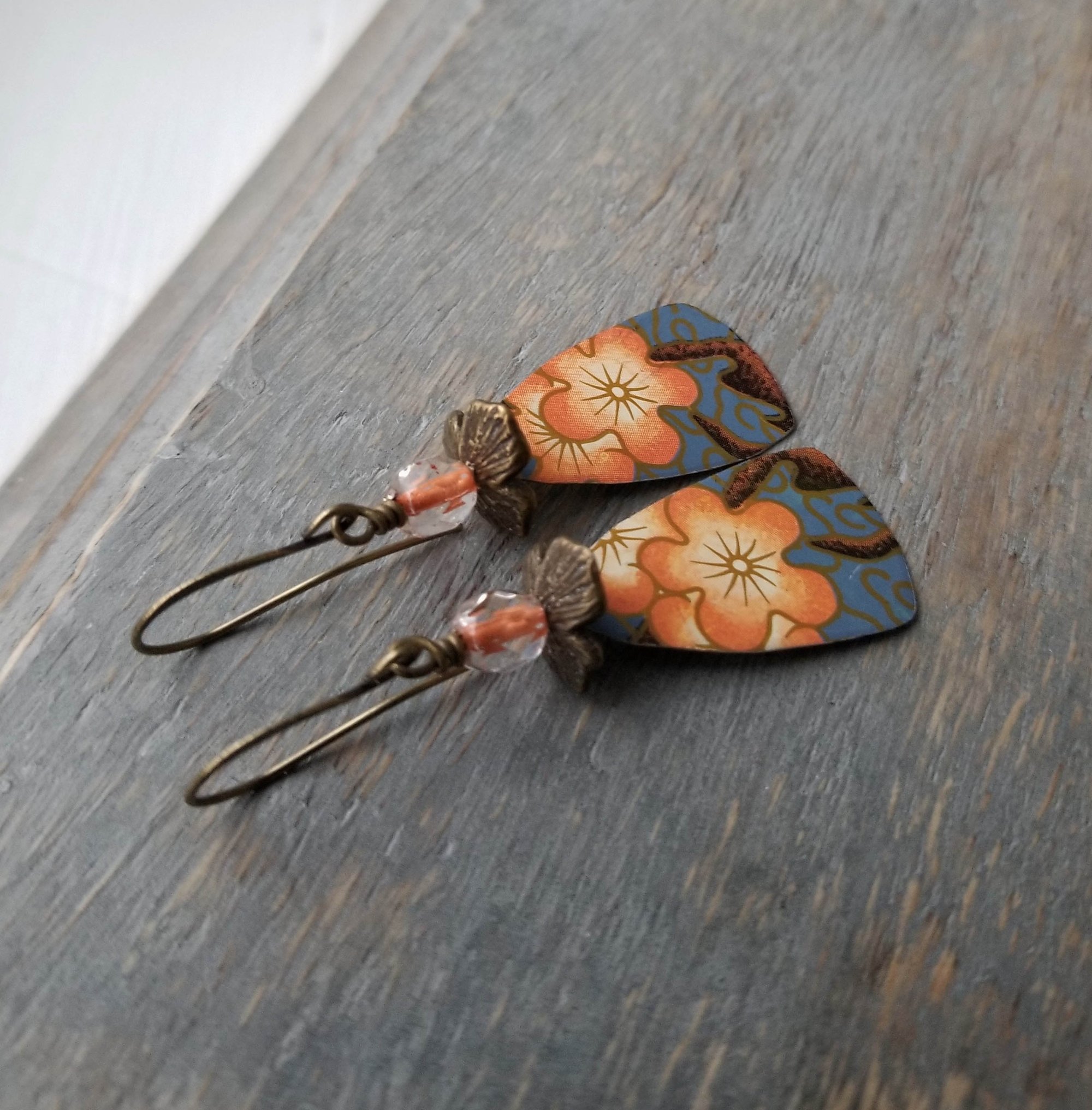 Hand-cut from a vintage tea tin, these earrings have been made to resemble porcelain pottery-shards. Topped with brass tropical leaf caps and orange lined glass beads. Hanging from antique brass ear wires (naturally lead and nickel free). Aloha - they're sweet.