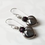 Plump pewter-colored glass heart earrings, lovely and sweet. Topped with tiny pinkish purple crystals. Hanging from sterling silver ear wires. Length is 1-1/2" from the top of the ear wire to the bottom of the bronze heart.
