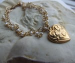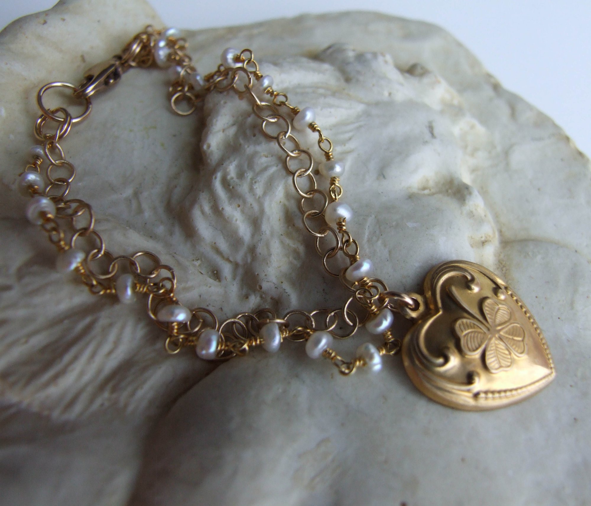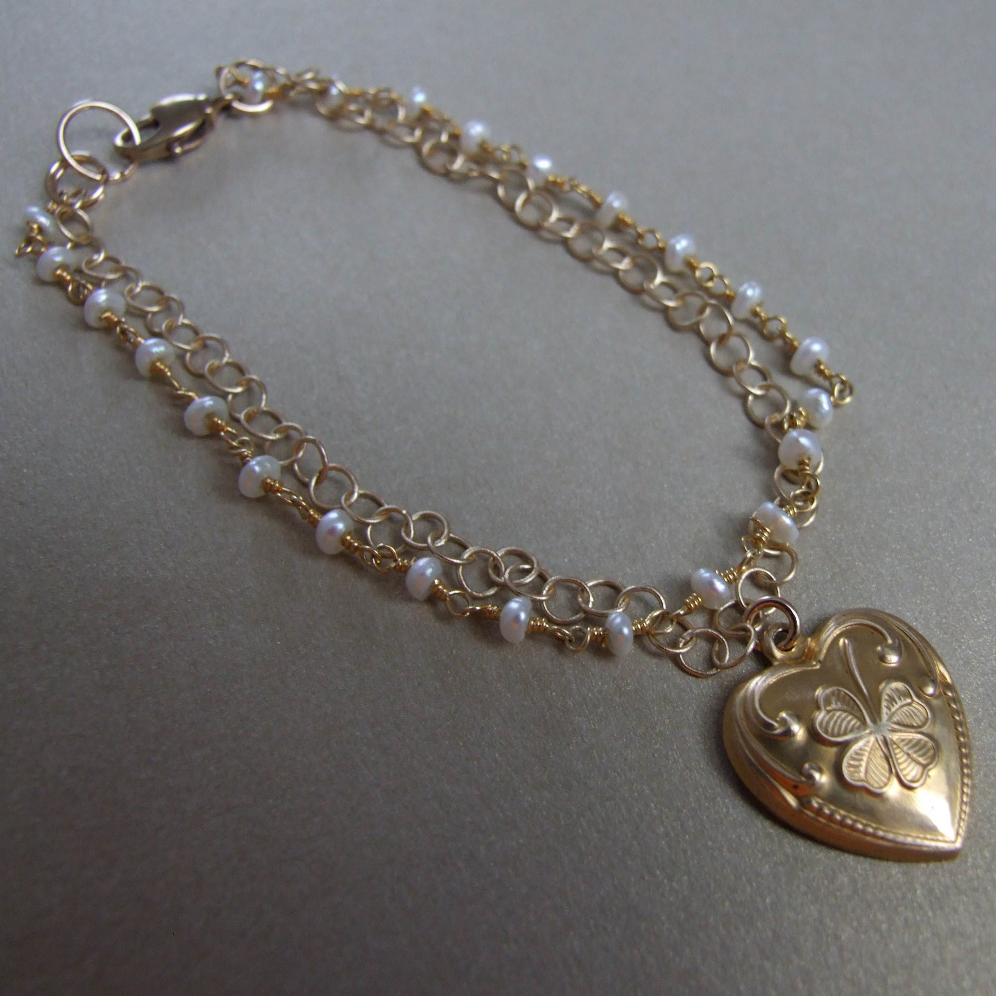 A pretty vintage brass good luck shamrock heart hangs from a double strand bracelet of tiny freshwater pearls and fine gauge brass chain. Finished with a brass lobster clasp. Length is 7”.