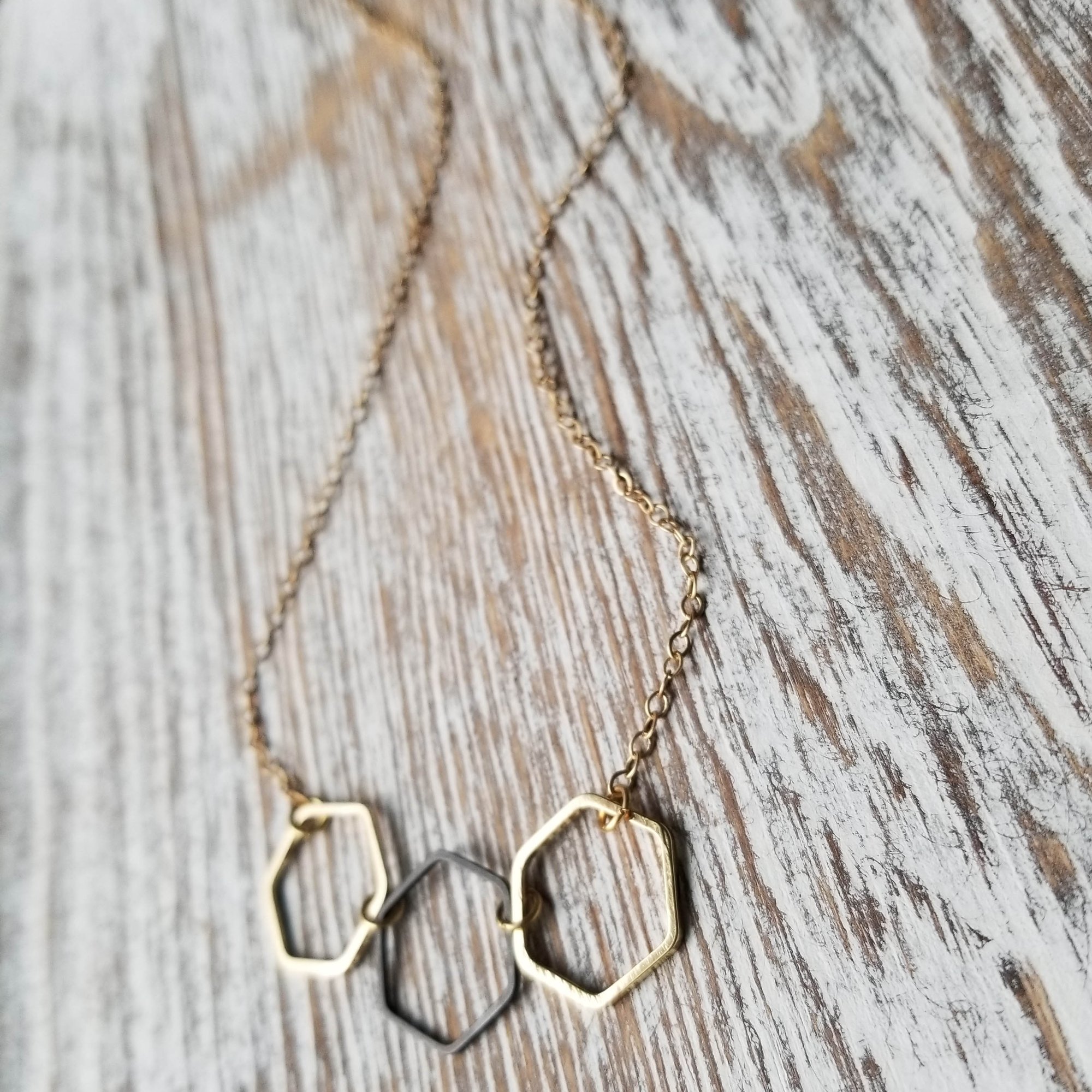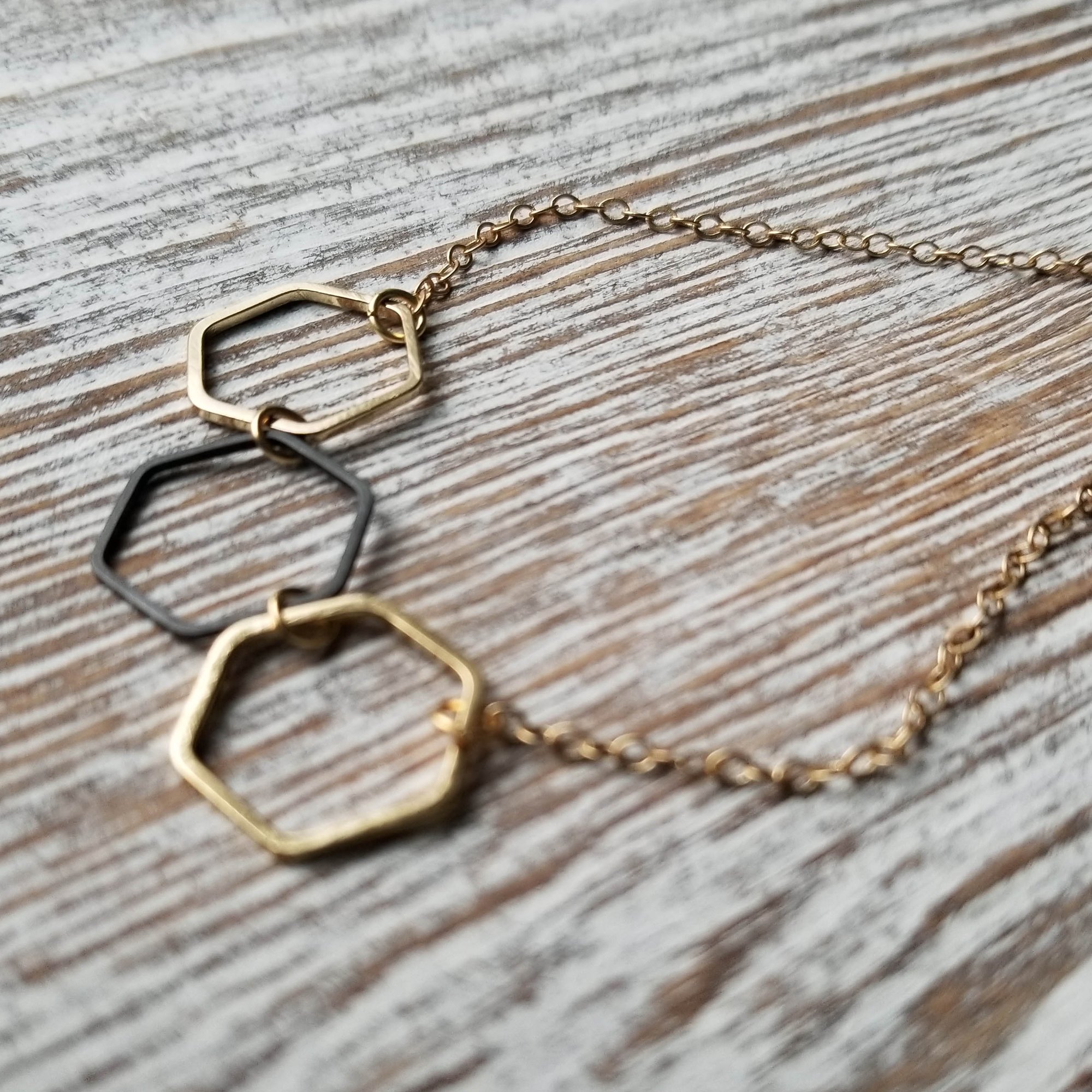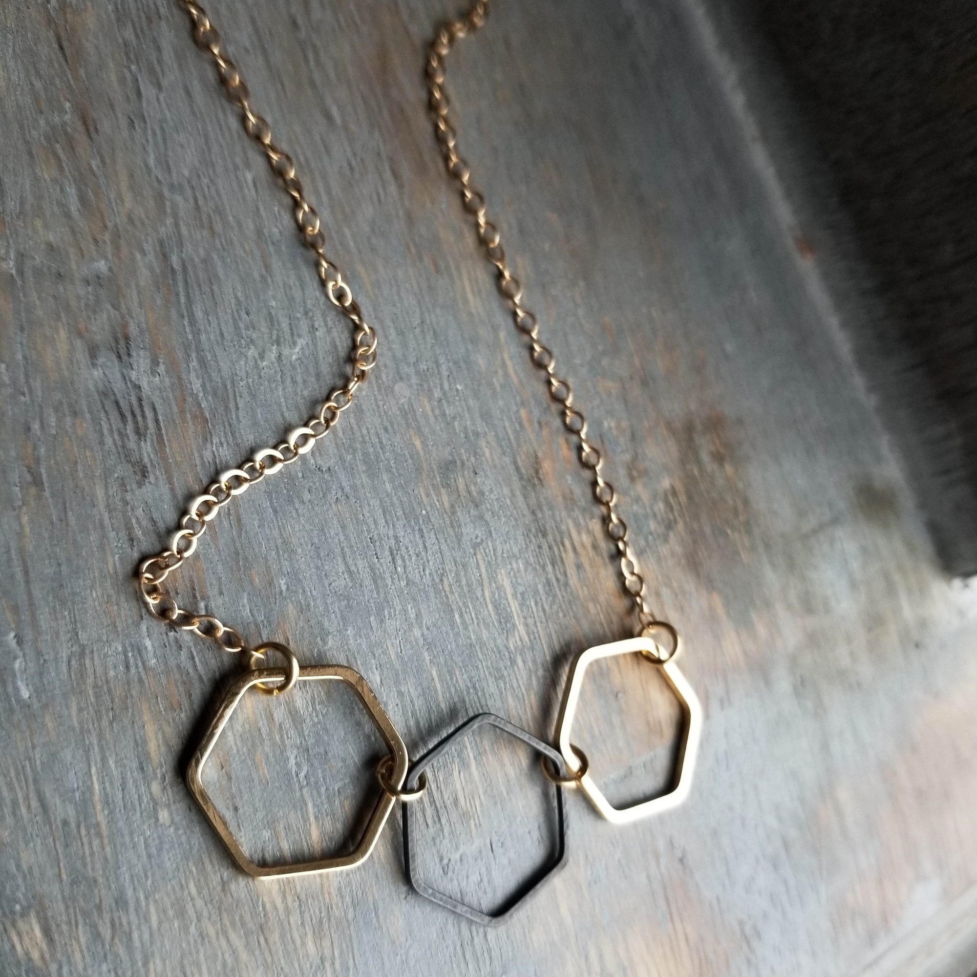 A trio of hexagonal links in matte gold and black form a simple focus for this interesting necklace. Blackened chain with elongated links. Super versatile. Hex links measure 5/8" each. Finished with an matte gold lobster clasp.
