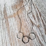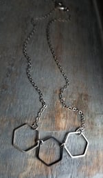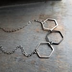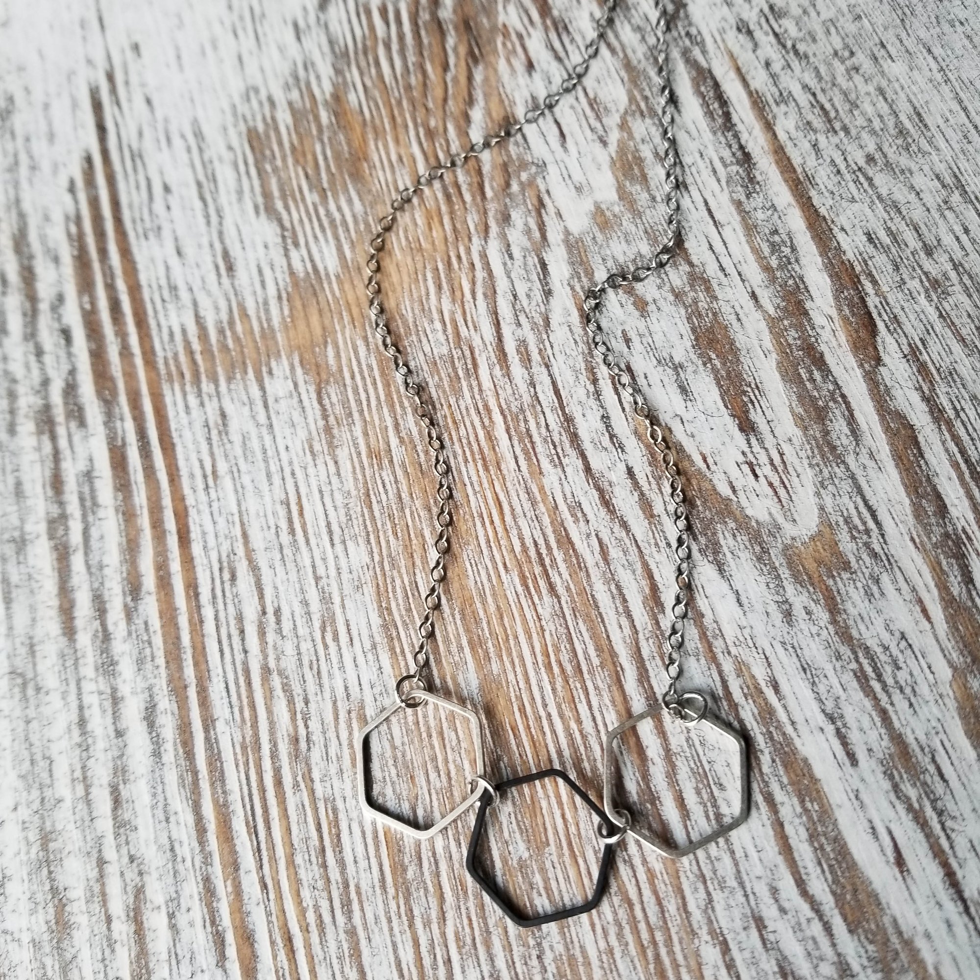 A trio of hexagonal links in matte silver and black form a simple focus for this interesting necklace. Super versatile. Hex links measure 5/8" each. Finished with a silver lobster clasp. Length is adjustable from 16" - 19".