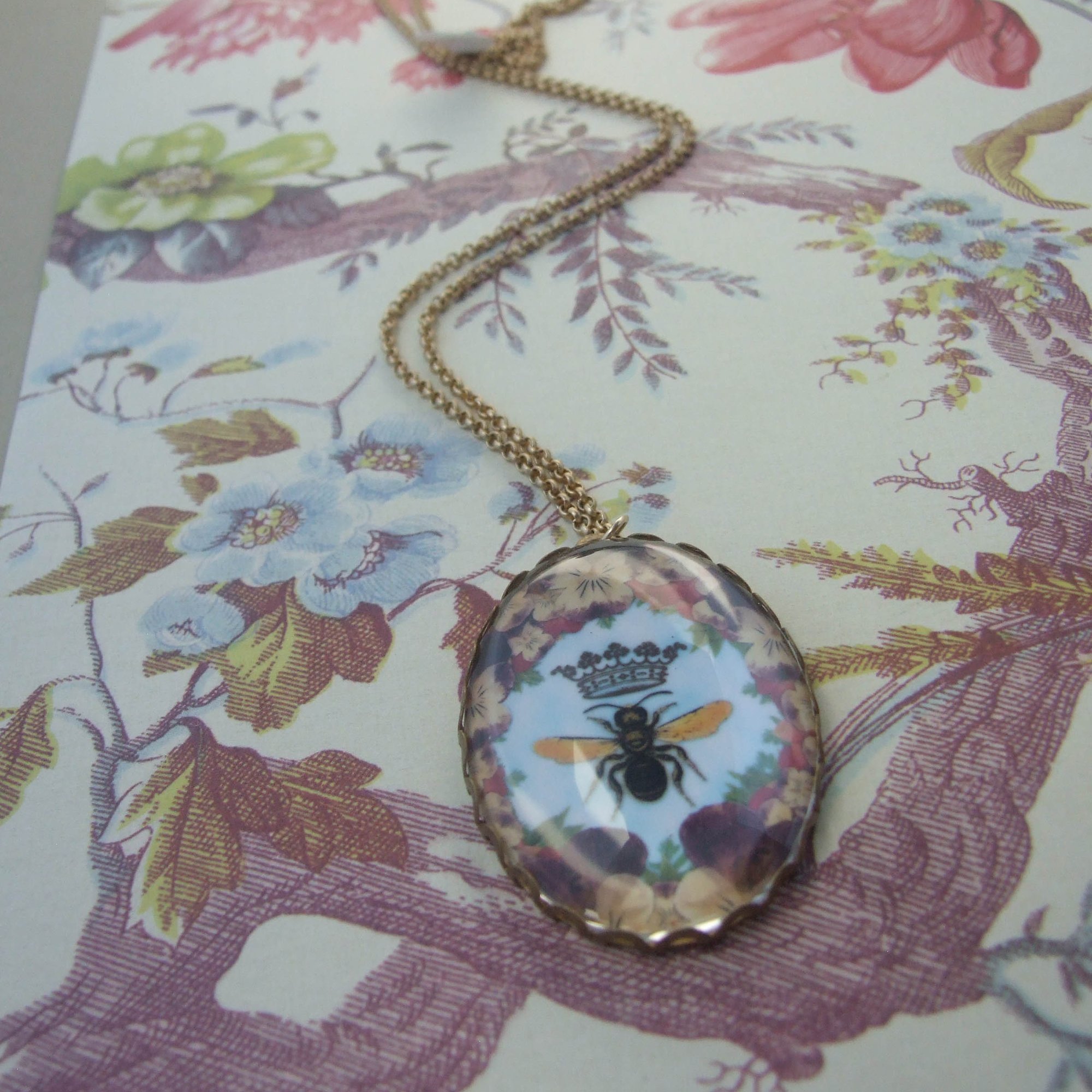 An image of a honeybee queen floats among a sea of pansies. Nestled in a brass lace bezel. Hangs from a matte gold brass chain (naturally lead and nickel free). No clasp. The honeybee is a symbol of love in sweet abundance.