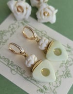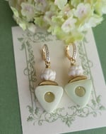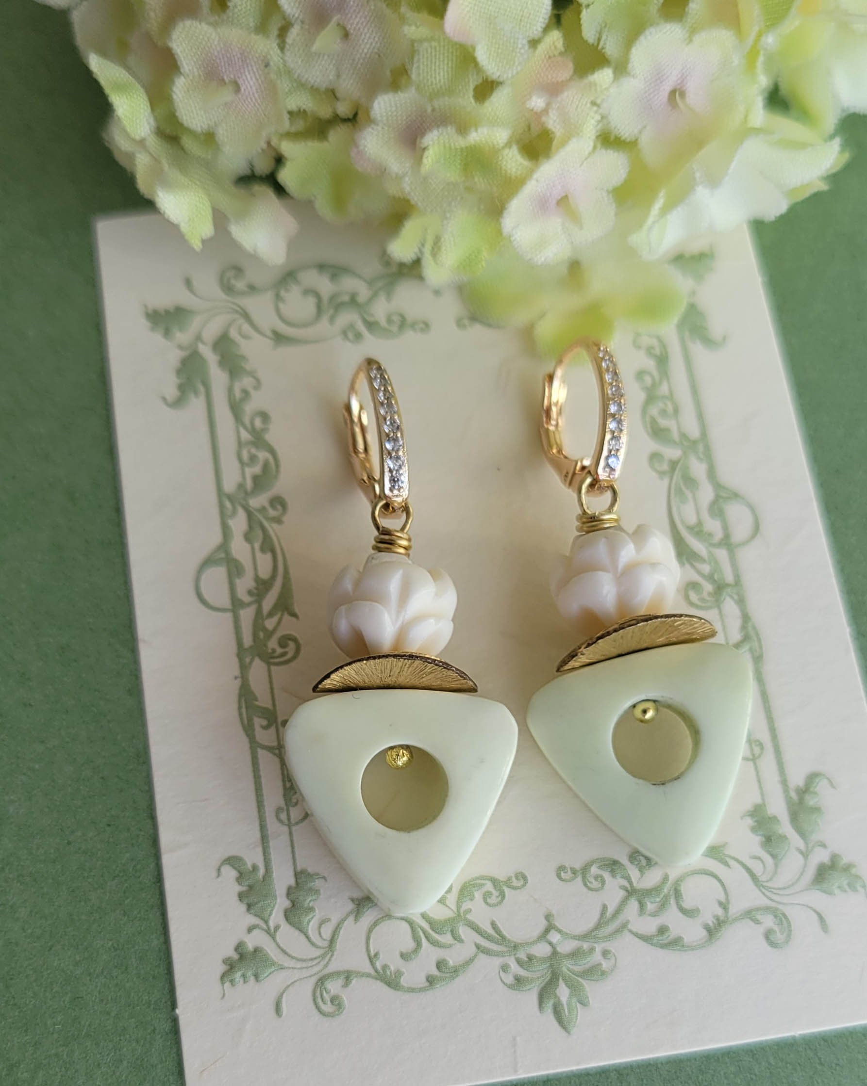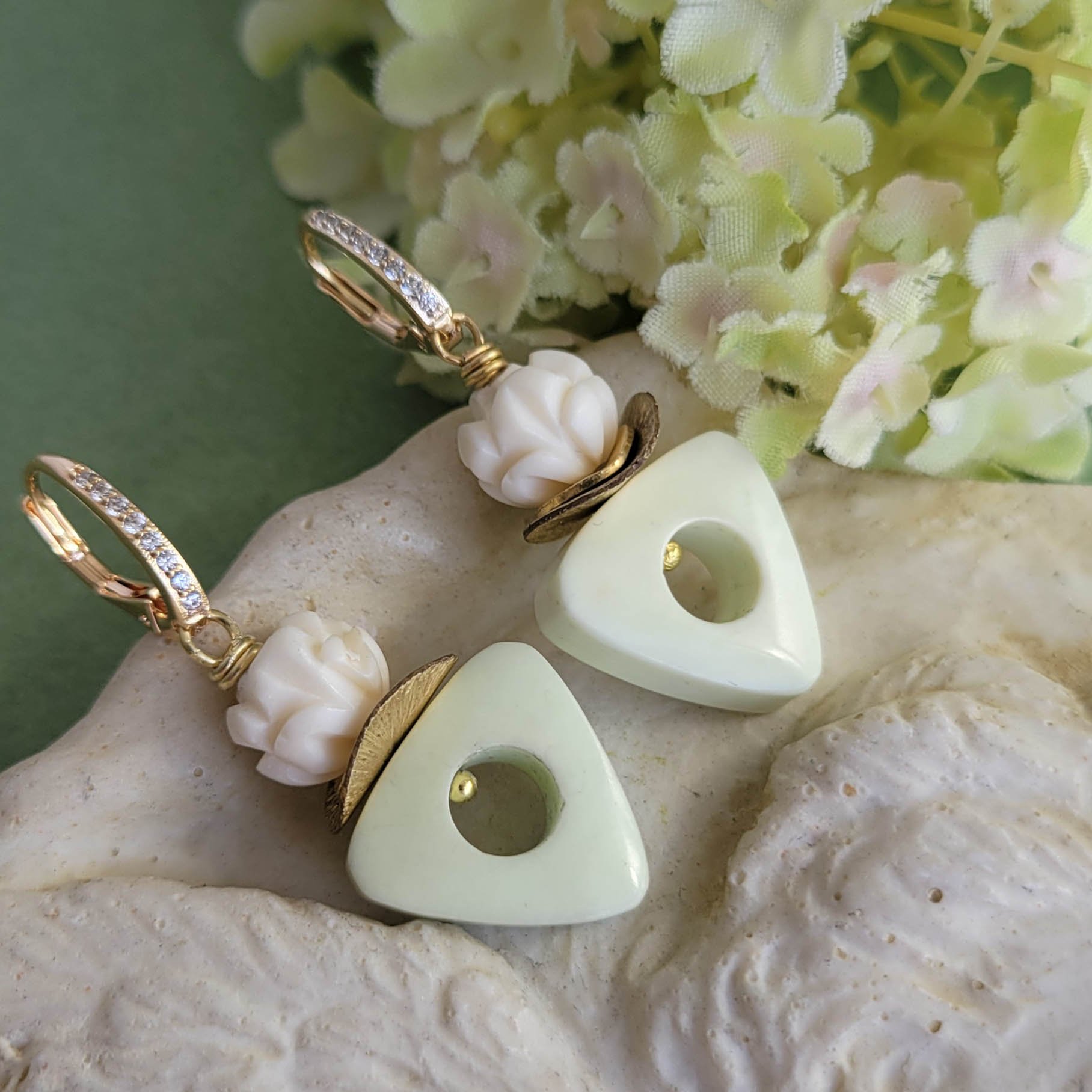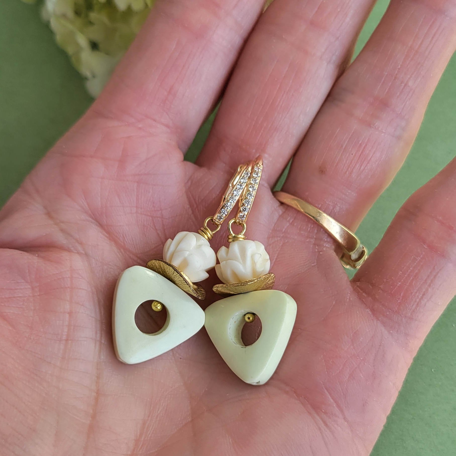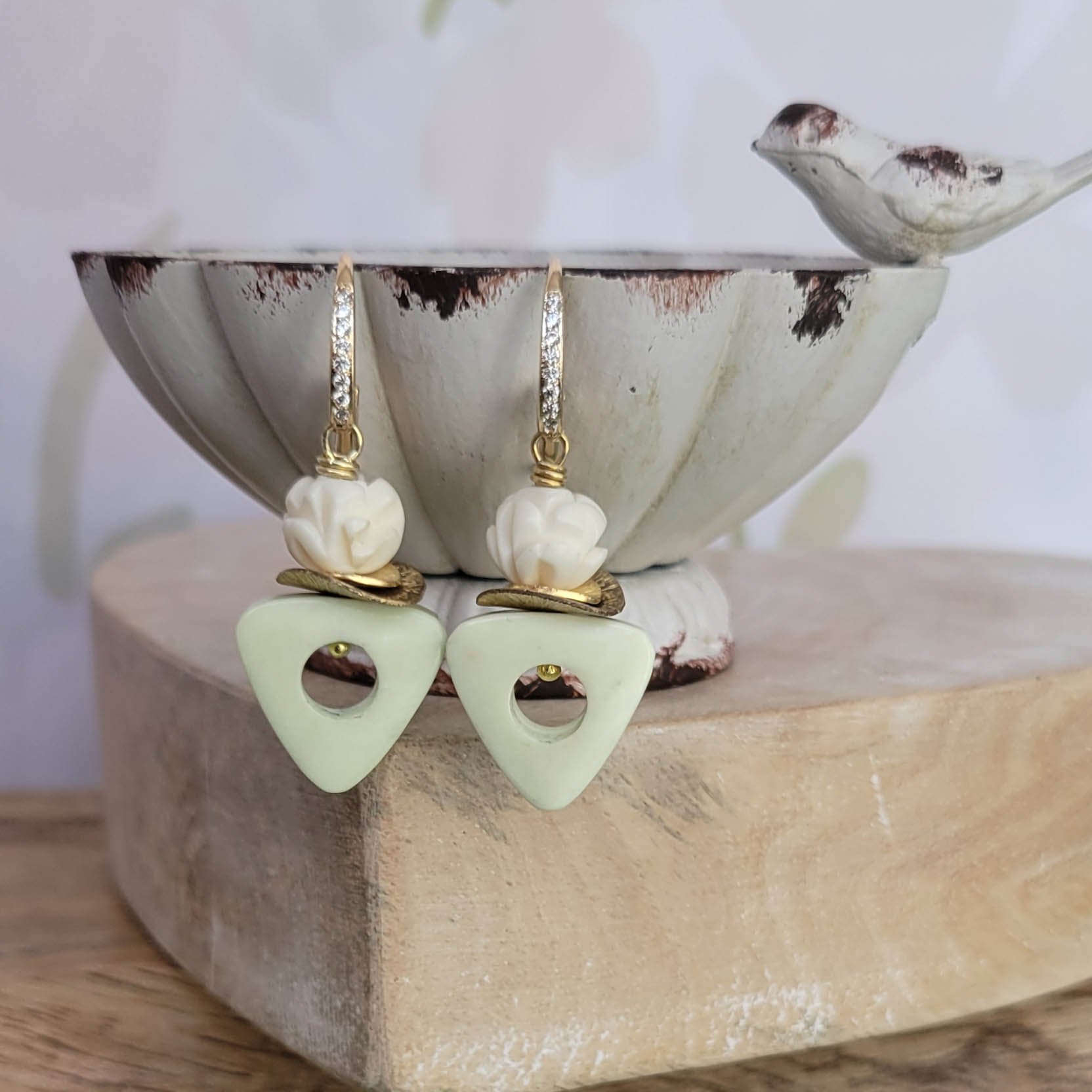 Softly colored lemon-lime chrysoprase triangles are topped with carved white lotus flowers and wavy brass spacers. Hanging from cz encrusted lever back ear wires. Lovely soft colors reminiscent of a sunny summer day.