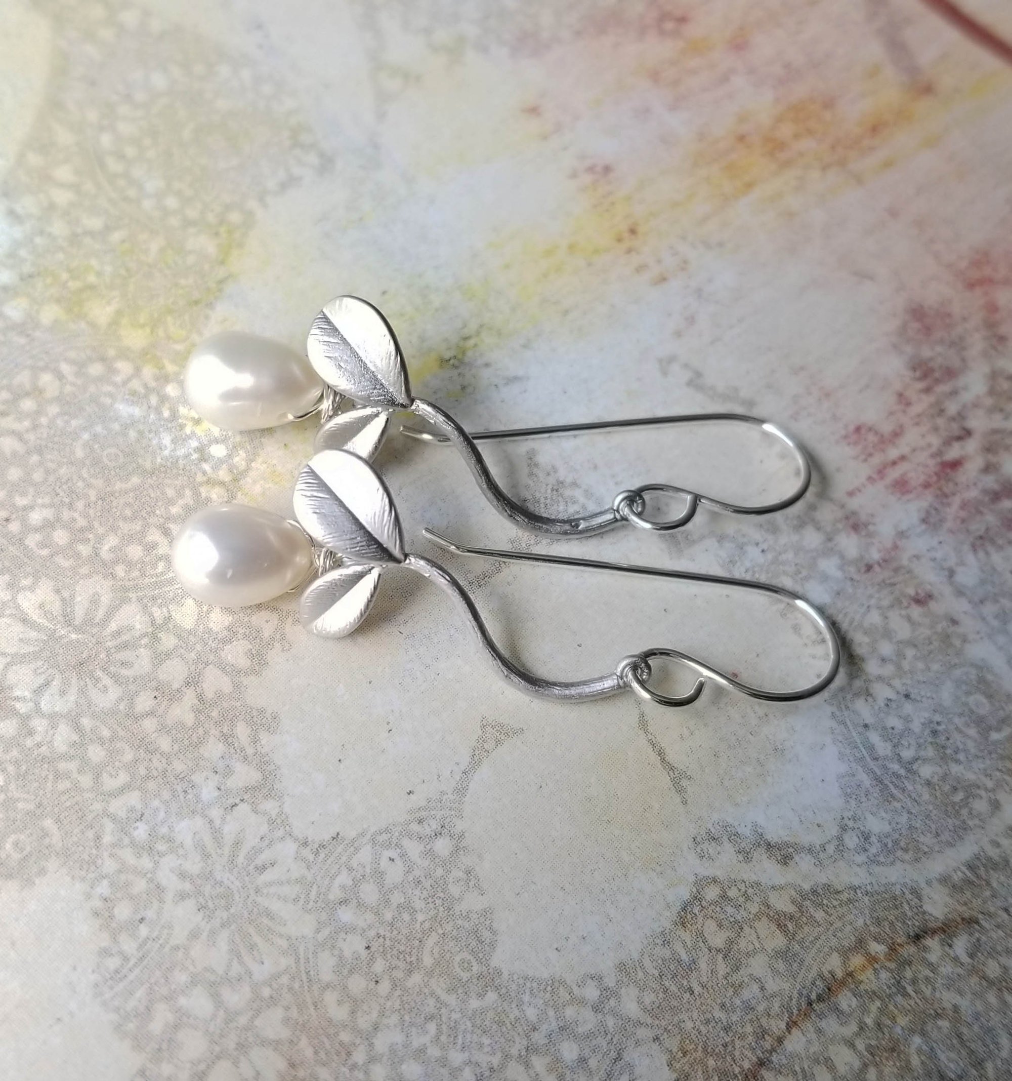 Tiny freshwater pearl "sprouts" dangle beneath matte silver leaves. Hanging from sterling silver earwires. Length is a tad over 1-1/2".