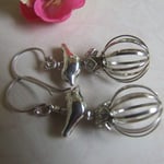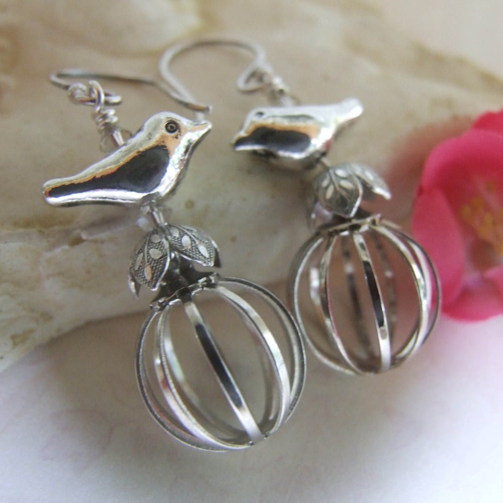 Silver love birds sit freely atop their vintage silver cage. All hanging from simple sterling silver ear wires.