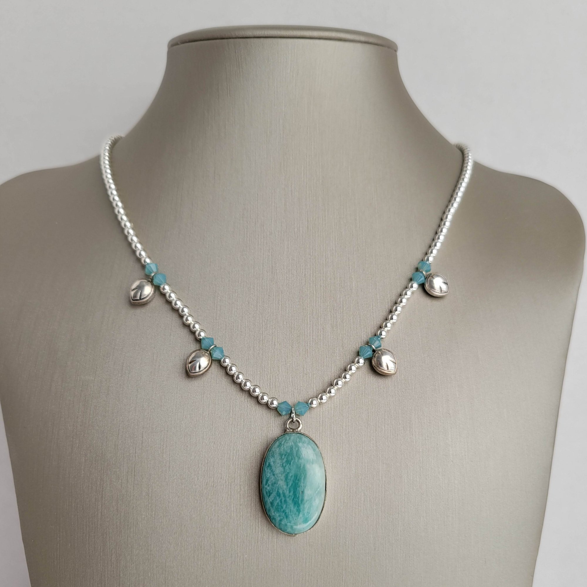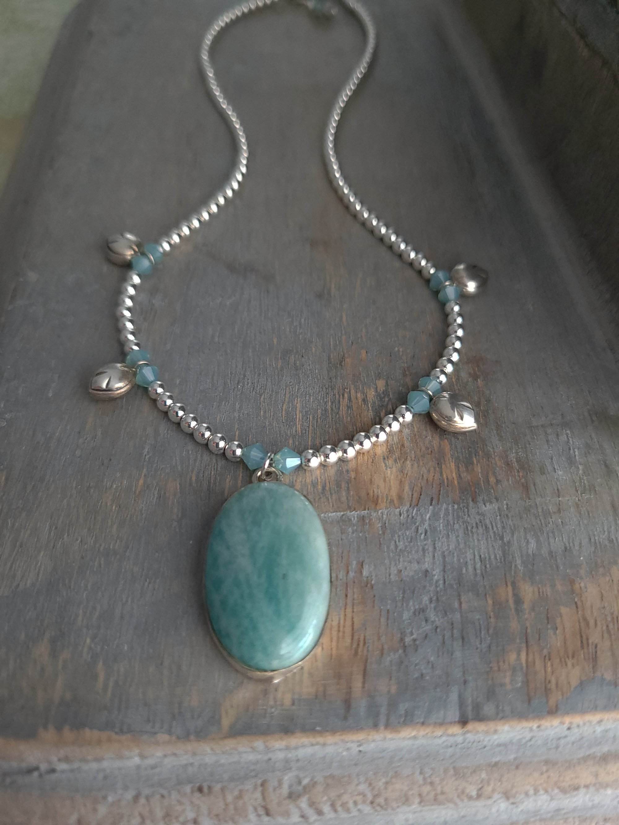 An aqua blue amazonite pendant, encased in a sterling silver bezel, hangs from a strand of small (3mm) shiny silver plated hematite. Dotted with opaline Swarovski crystals + Thai sterling silver teardrop charms.