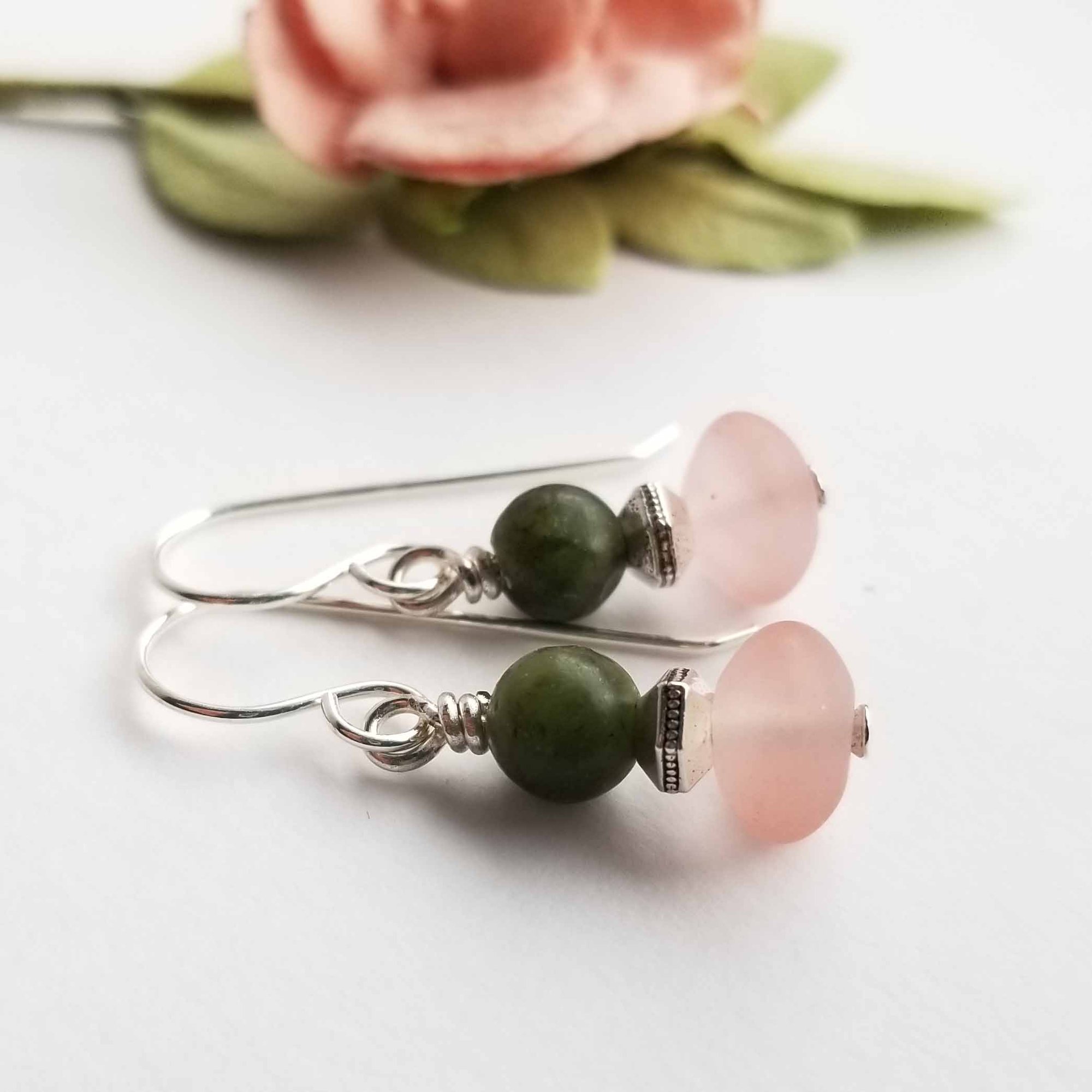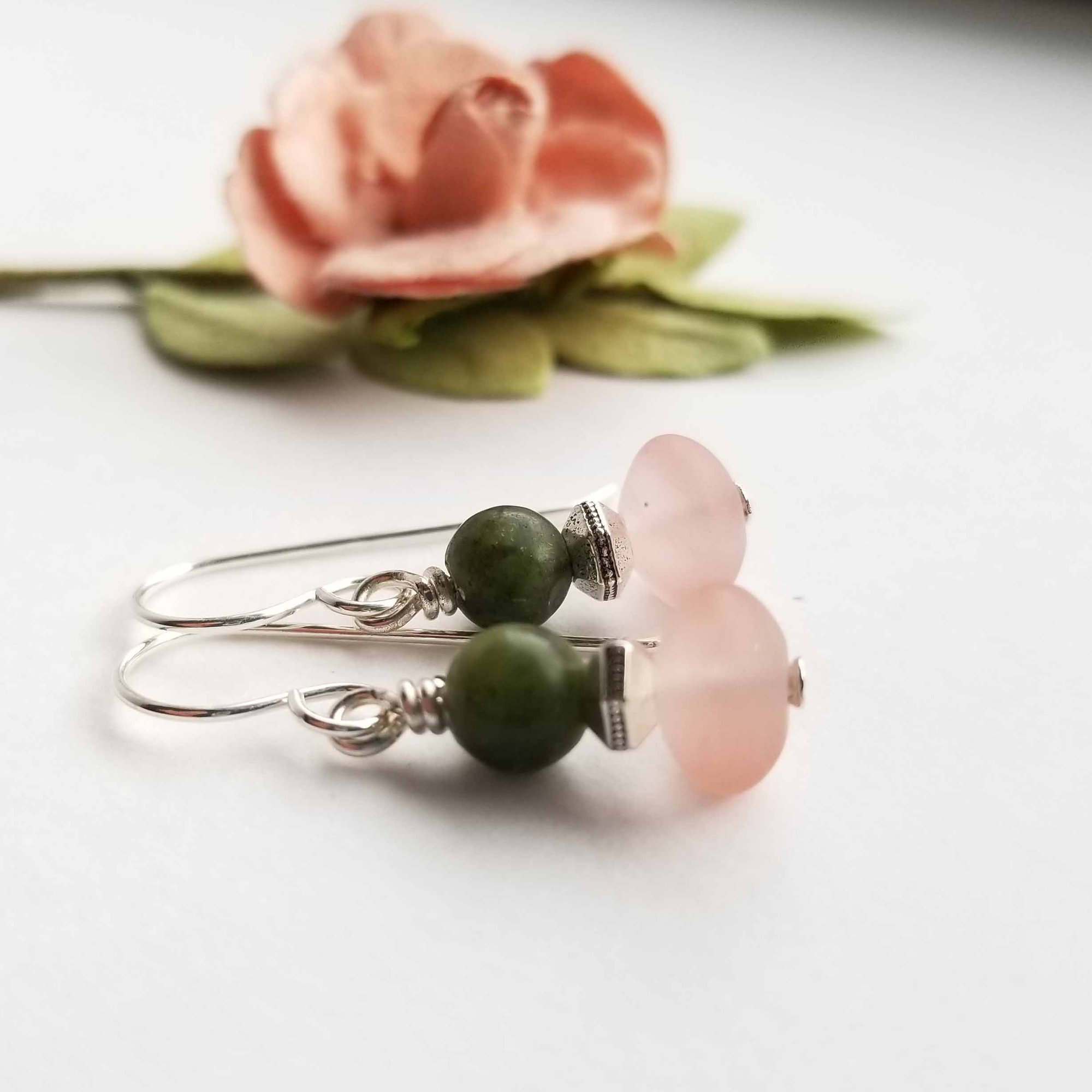 Sweet tiny earrings made from matte peach-colored rondelles and green jade. Hanging from sterling silver ear wires.