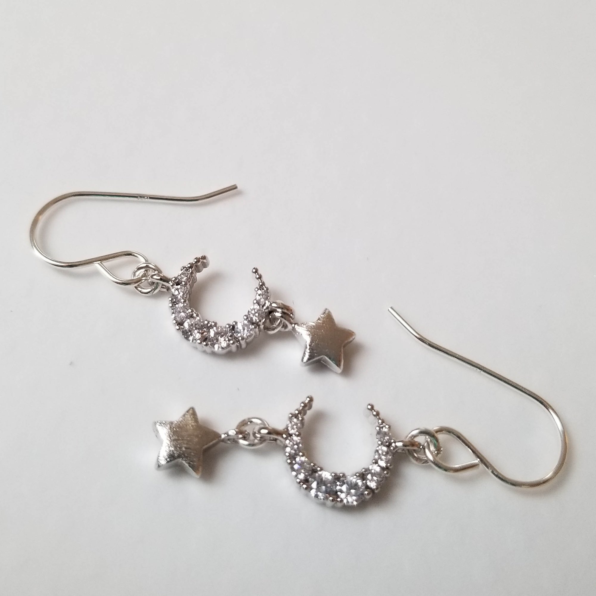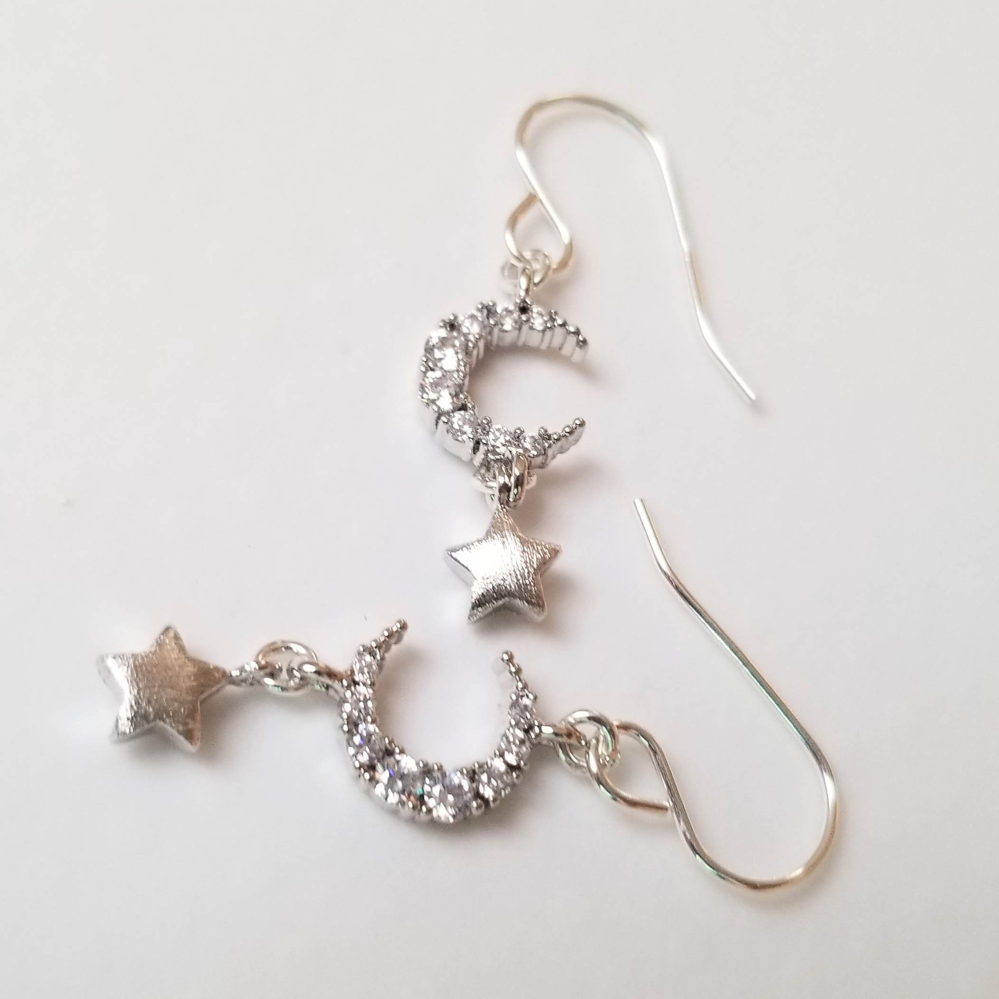 Tiny brushed silver plated brass stars sway beneath CZ encrusted silver crescent moons. Sterling silver l ear wires. Dreamy. Length is 1.5” from the top of the ear wire to the bottom of the star.