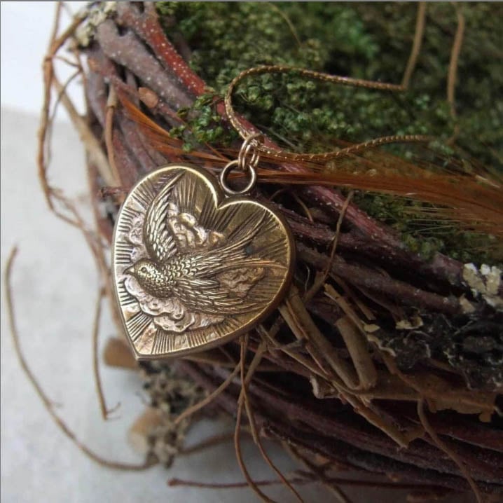 Very romantic. A beautifully detailed vintage brass heart hangs from a simple vintage brass chain. Simply lovely. Pendant is 1" Necklace length is 16". Finished with a spring ring clasp.