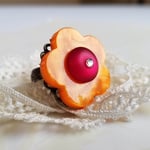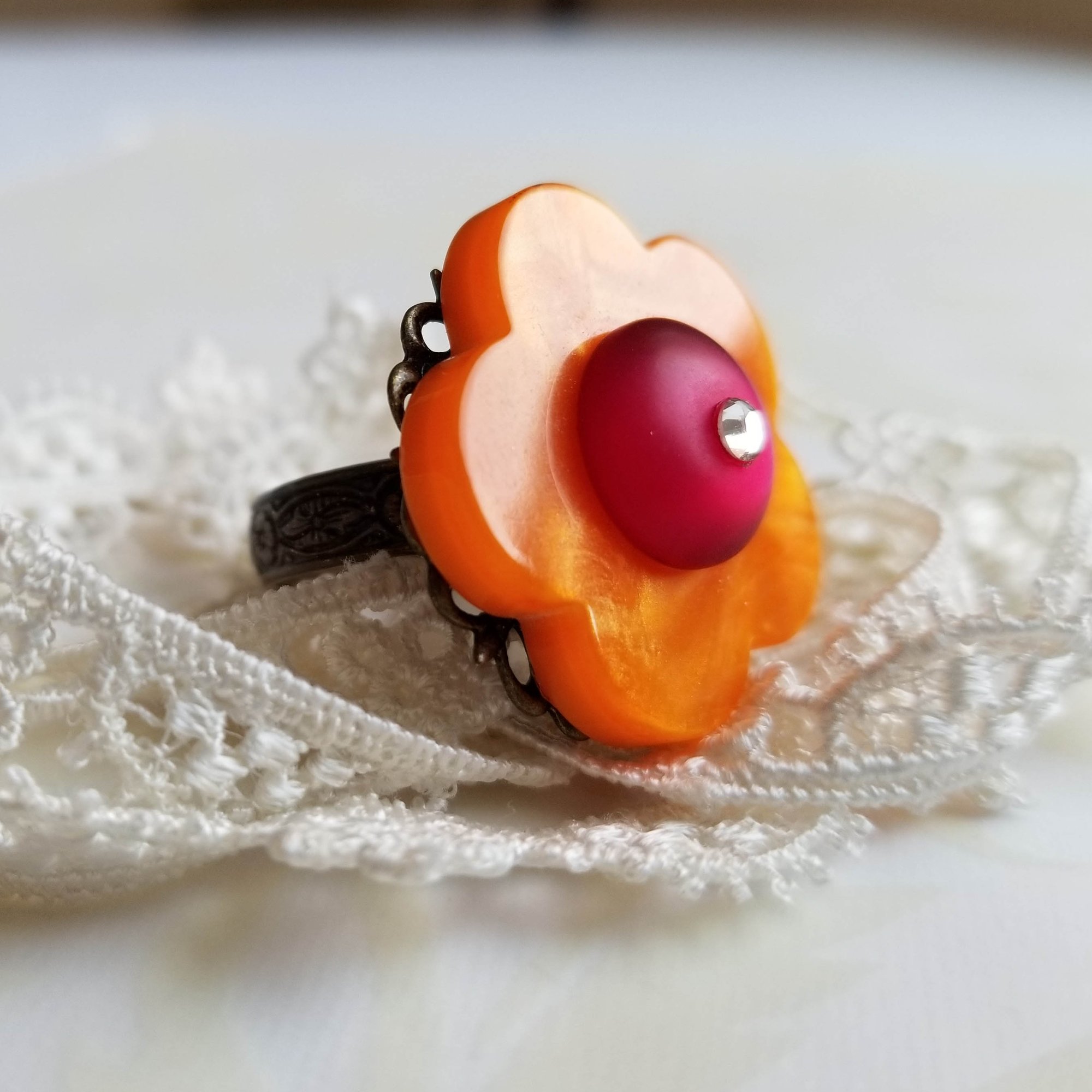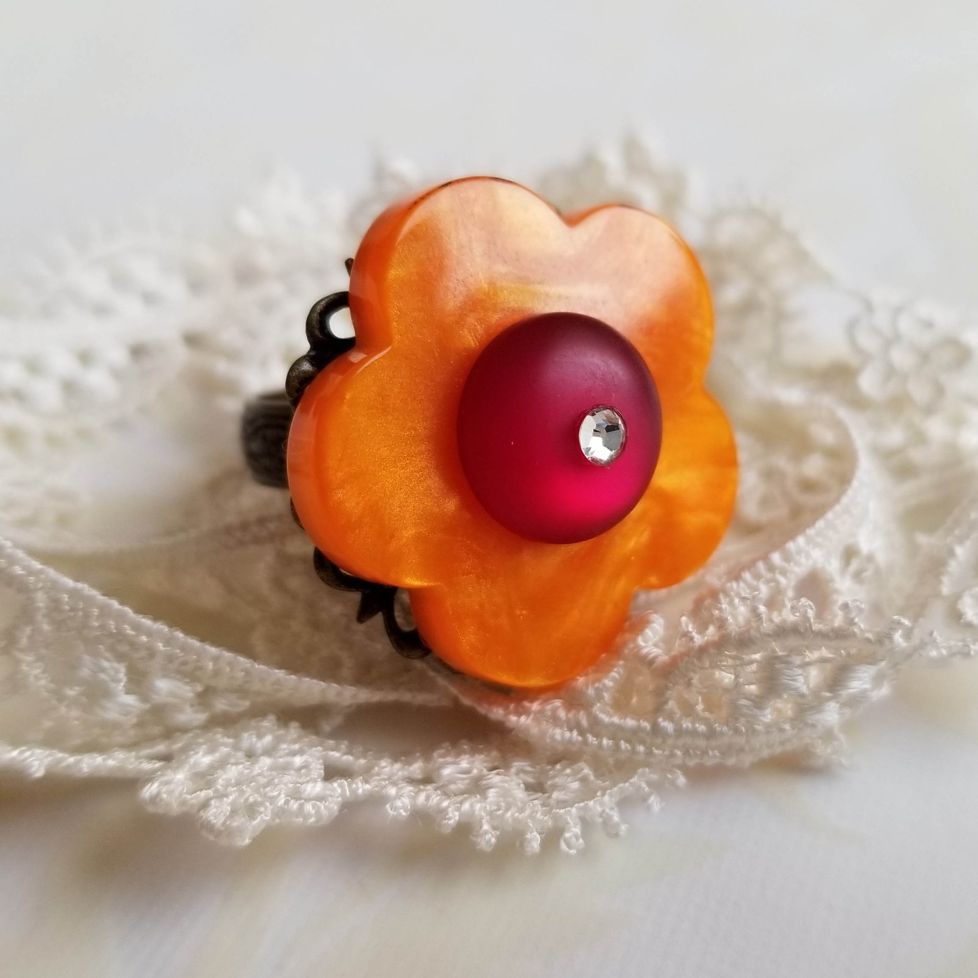 A bright orange flower is accented with a ruby rhinestone dotted center. Brass one-size-fits-most ring. Lead and nickel free.