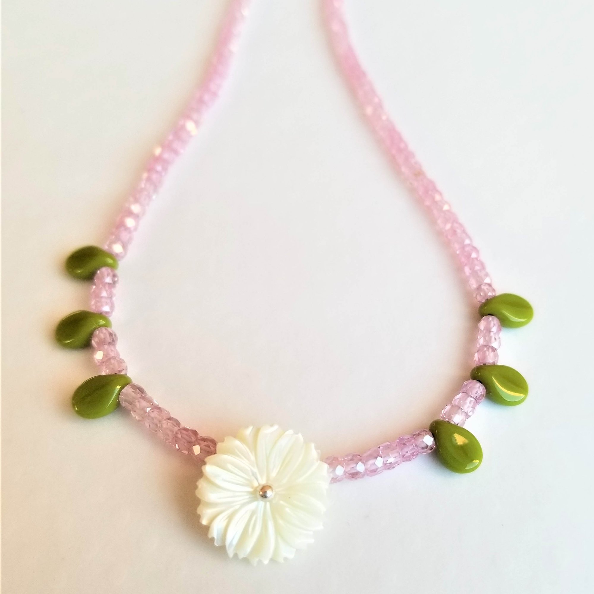 A lovely carved white mother of pearl chrysanthemum is nestled within a strand of itty bitty (3mm) faceted pink zircon beads punctuated with tiny green czech glass leaves. Lovely. Delicate. Feminine.