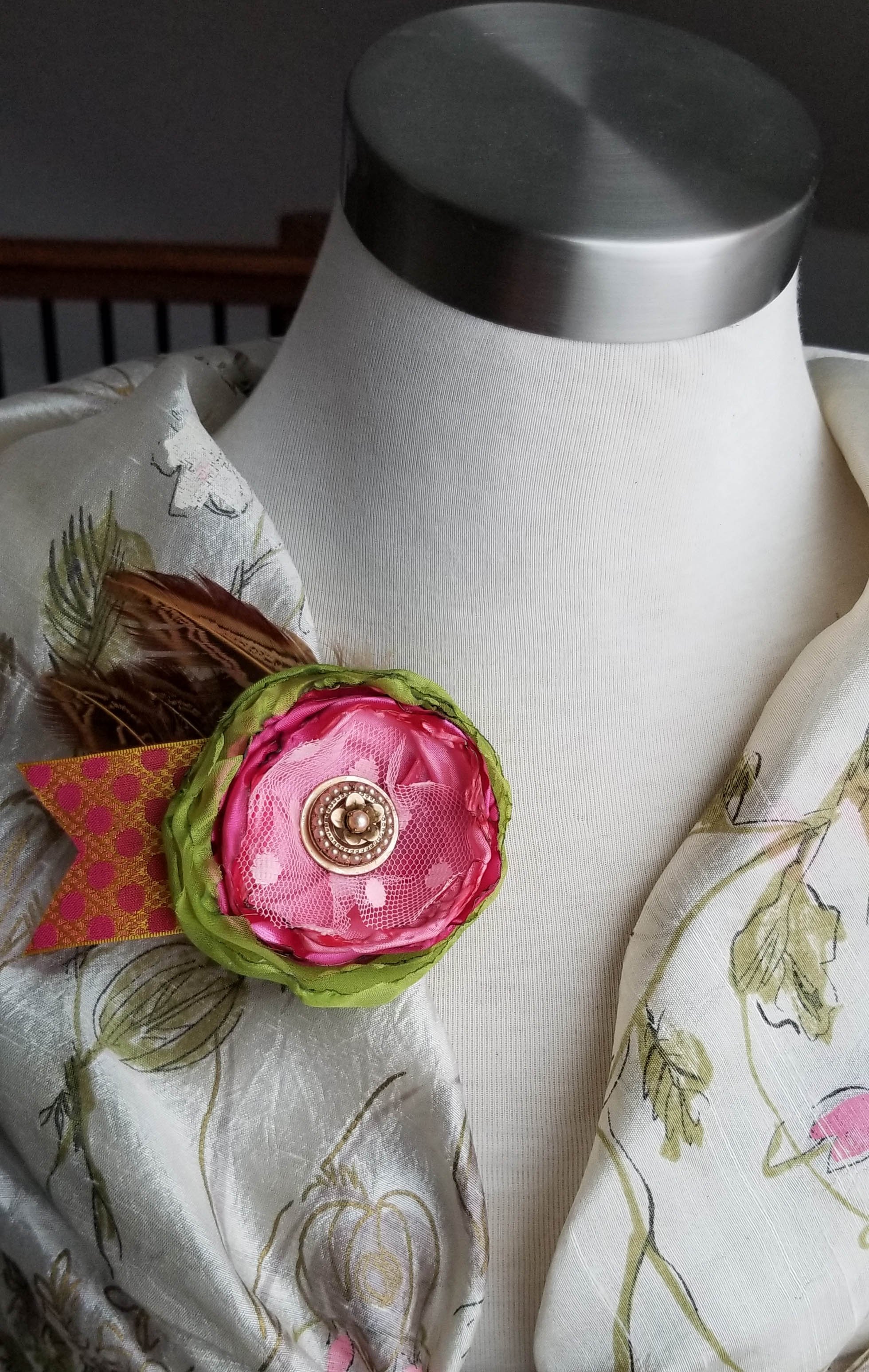 Happy bright pink. A big handmade (by me!) floral brooch. A beautiful nest of fabrics and feathers in a variety of textures and colors (pink, green, and orange). The center is accented with a stunning re-purposed vintage earring. Back is beautifully finished with wool felt.