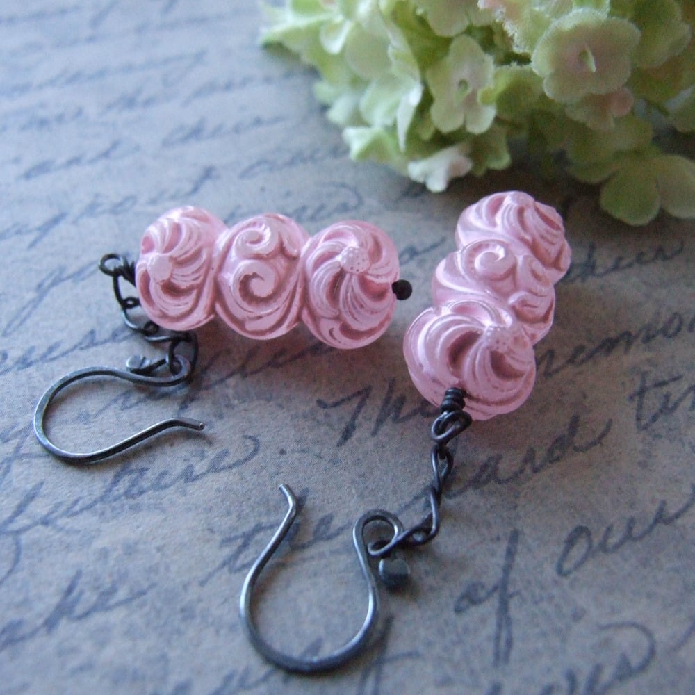 Voluptuous, sexy swirls abound in these pretty girly pink earrings. Made from vintage lucite beads swinging from oxidized sterling silver chain all hanging from oxidized sterling silver ear wires. Length is a tad over 2-1/4” from the top of the ear wire to the bottom of the lucite bead.