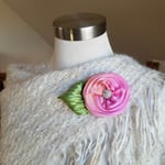 OMG gorgeous. A big hand sewn (by me!) floral brooch. Beautiful hand-dyed silk in variegated soft pink and peachy orange tones with a hand-dyed green silk leaf. The center is accented with a stunning vintage rhinestone brooch. Super lovely and very special. Back is beautifully finished with wool felt.
