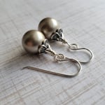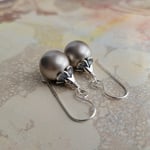 Plump platinum-colored Swarovski pearls are topped by textured sterling silver petal caps. Pearls measure 12mm (1/2”).