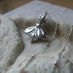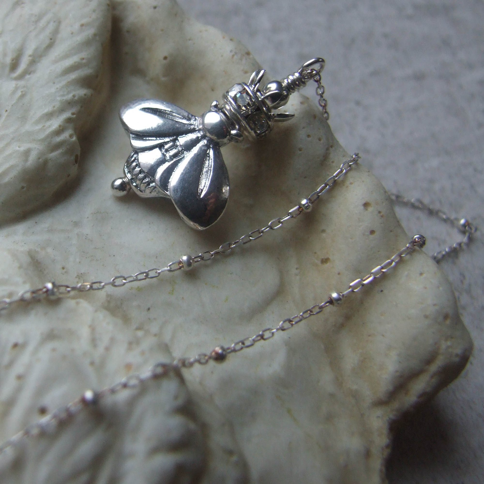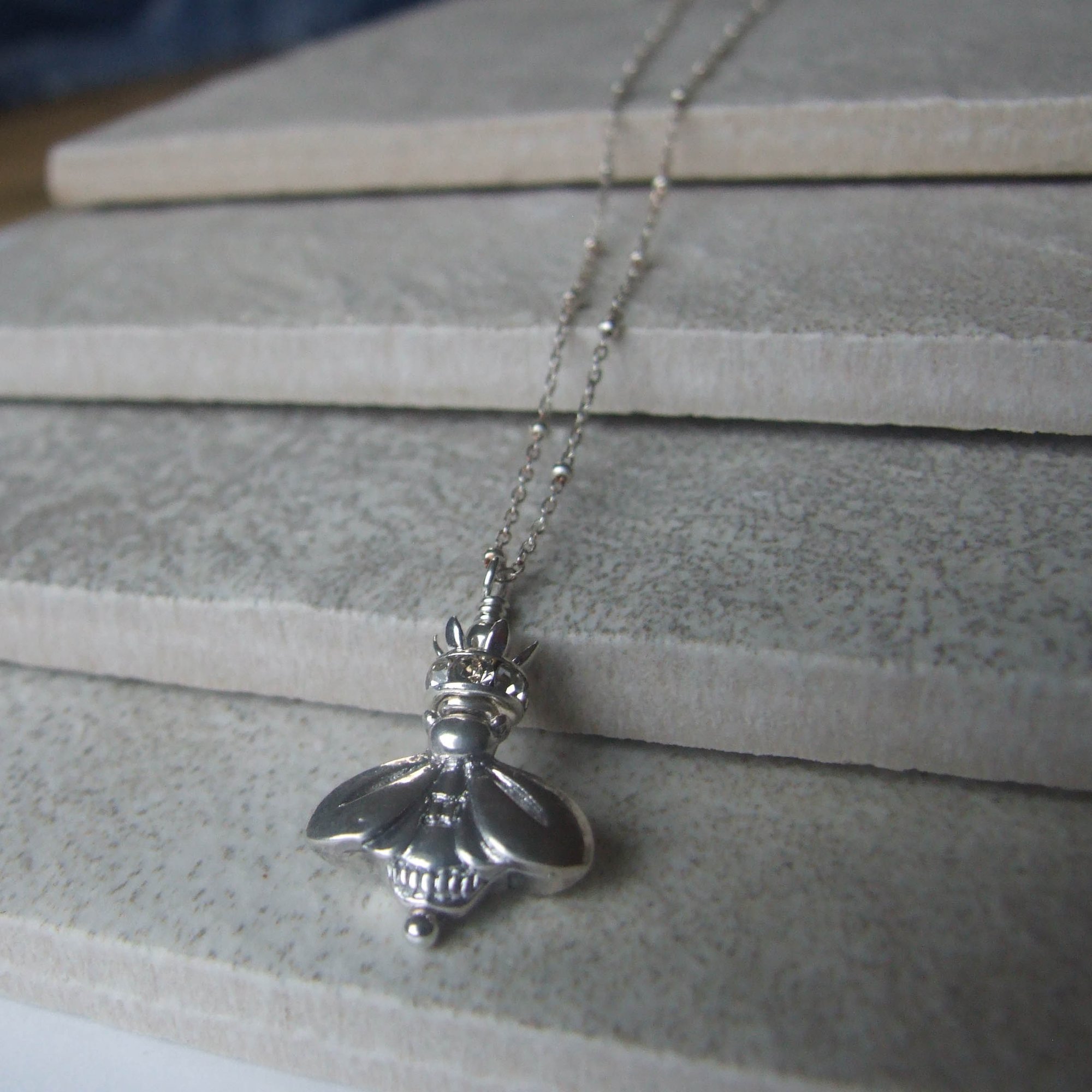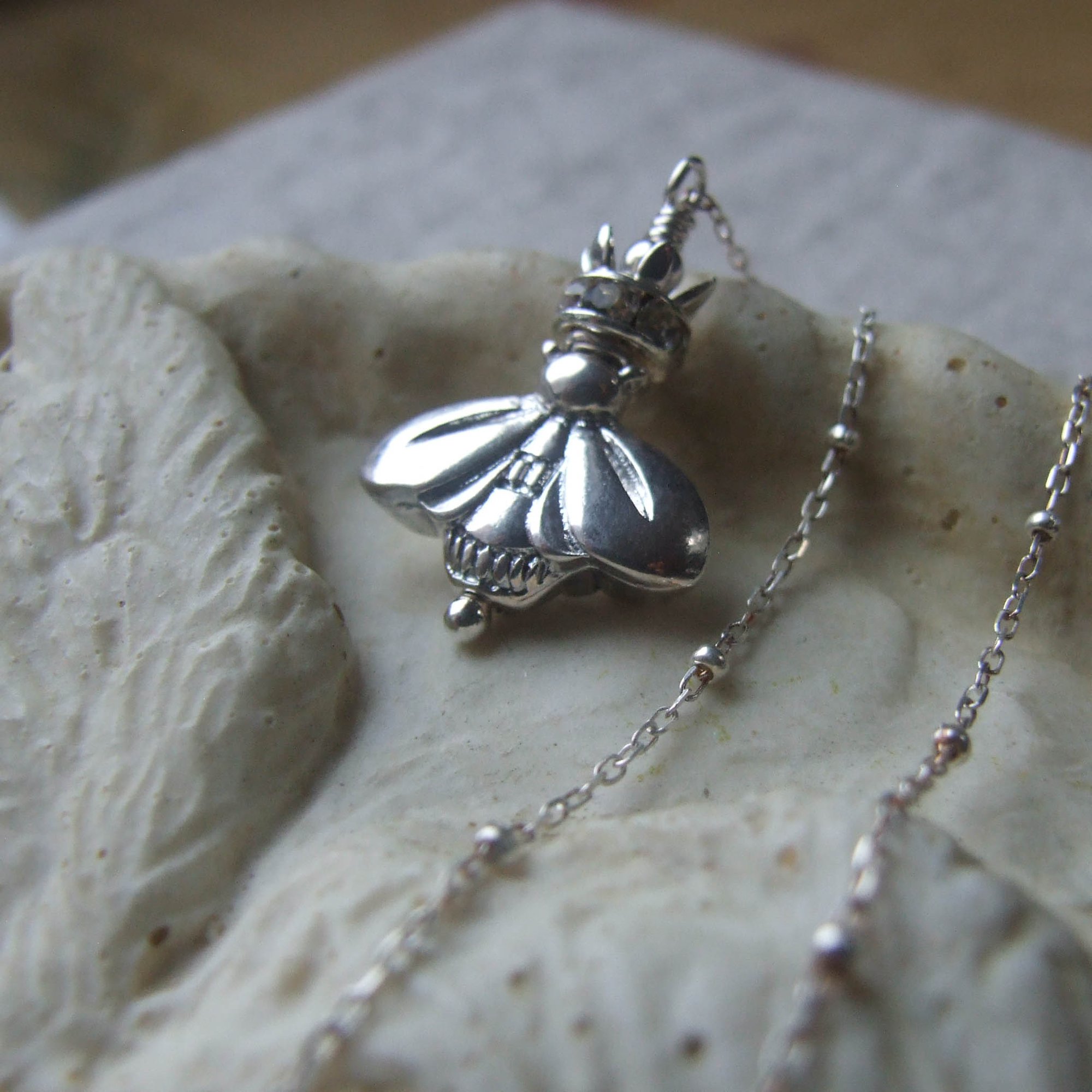 A crowned queen bee (vintage silver plated) hangs from a dotted sterling silver satellite chain. Finished with a sterling spring ring clasp. The honeybee is a symbol of love in sweet abundance.