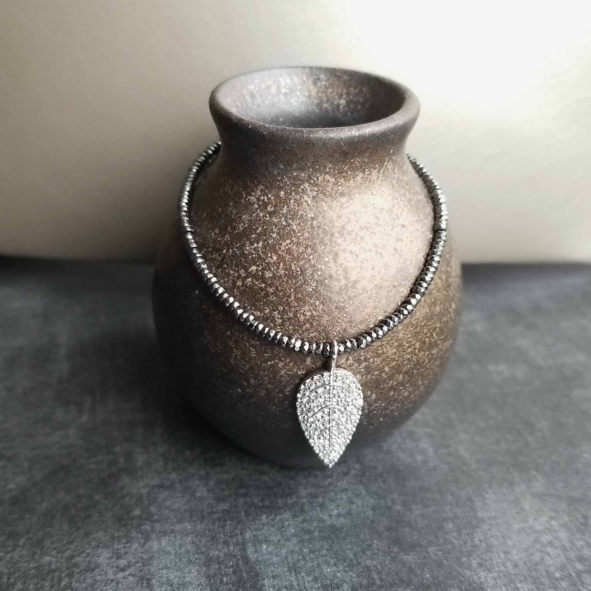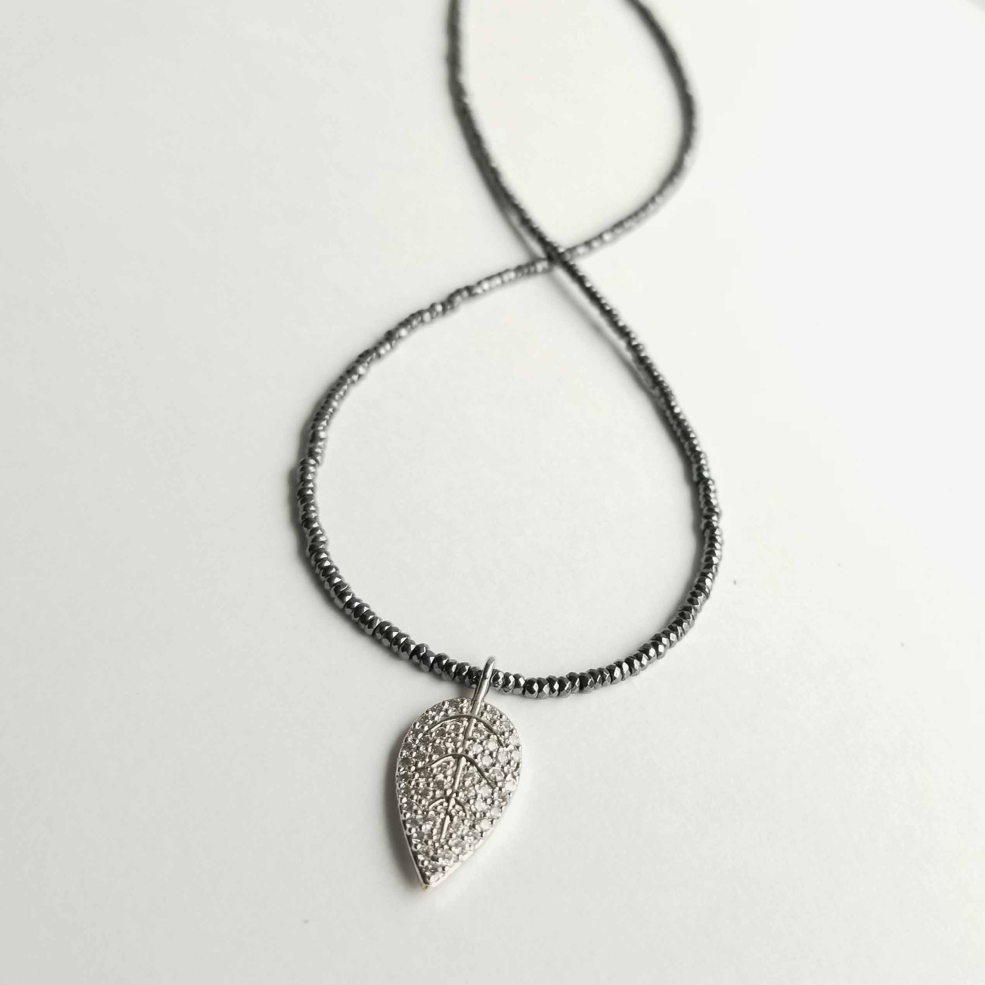 Teeny tiny (2mm x 1mm) high luster black spinel rondelle beads provide the perfect quiet backdrop for the stunning silver pave leaf pendant. This is a quietly elegant necklace. Length is adjustable from 15-1/2” – 17-1/2”. Finished with a sterling silver lobster clasp.
